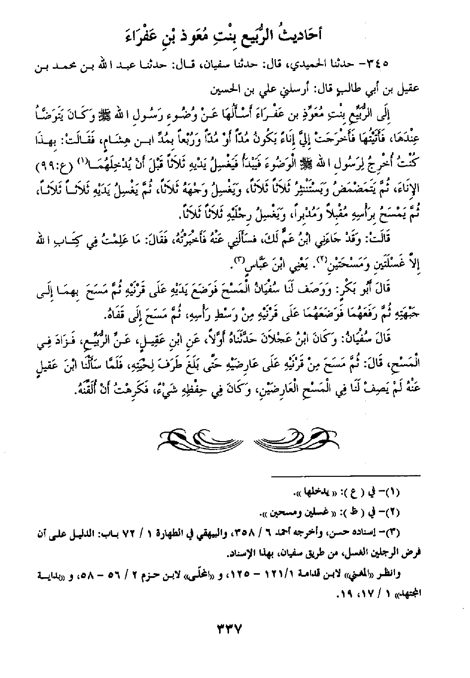 345 - حَدَّثَنَا الْحُمَيْدِيُّ قَالَ: ثنا سُفْيَانُ قَالَ: ثنا عَبْدُ اللَّهِ بْنُ مُحَمَّدِ بْنِ عَقِيلِ بْنِ أَبِي طَالِبٍ قَالَ: أَرْسَلَنِي عَلِيُّ بْنُ الْحُسَيْنِ إِلَى الرُّبَيِّعِ بِنْتِ مُعَوِّذِ ابْنِ عَفْرَاءَ؛ أَسْأَلُهَا عَنْ وُضُوءِ رَسُولِ اللَّهِ صَلَّى اللهُ عَلَيْهِ وَسَلَّمَ وَكَانَ يَتَوَضَّأُ عِنْدَهَا فَأَتَيْتُهَافَأَخْرَجَتْ إِلِيَّ إِنَاءً يَكُونُ مُدًّا أَوْ مُدَّا وَرُبْعًا بِمُدِّ بَنِي هَاشِمٍ فَقَالَتْ «بِهَذَا كُنْتُ أُخْرِجُ لِرَسُولِ اللَّهِ صَلَّى اللهُ عَلَيْهِ وَسَلَّمَ الْوَضُوءَ فَيَبْدَأُ §فَيَغْسِلُ يَدَيْهِ ثَلَاثًا قَبْلَ أَنْ يُدْخِلَهُمَا الْإِنَاءَ، ثُمَّ يَتَمَضْمَضُ وَيَسْتَنْثِرُ ثَلَاثًا ثَلَاثًا، وَيَغْسِلُ وَجْهَهُ ثَلَاثًا، ثُمَّ يَغْسِلُ يَدَيْهِ ثَلَاثًا ثَلَاثًا، ثُمَّ يَمْسَحُ بِرَأْسِهِ مُقْبِلًا وَمُدْبِرًا، وَيَغْسِلُ رِجْلَيْهِ ثَلَاثًا ثَلَاثًا» قَالَتْ: وَقَدْ جَاءَنِي ابْنُ عَمَّتِكَ فَسَأَلَنِي عَنْهُ فَأَخْبَرْتُهُ فَقَالَ: مَا عَلِمْنَا فِي كِتَابِ اللَّهِ إِلَّا غُسْلَيْنِ وَمَسْحَتَيْنِ يَعْنِي ابْنَ عَبَّاسٍ قَالَ أَبُو بَكْرٍ: وَوَصَفَ لَنَا سُفْيَانُ الْمَسْحَ فَوَضَعَ يَدَيْهِ عَلَى قَرْنَيْهِ ثُمَّ مَسَحَ بِهِمَا إِلَى جَبْهَتِهِ، ثُمَّ رَفَعَهُمَا وَوَضَعَهُمَا عَلَى قَرْنَيْهِ مِنْ وَسَطِ رَأْسِهِ، ثُمَّ مَسَحَ إِلَى قَفَاهُ قَالَ سُفْيَانُ: وَكَانَ ابْنُ عَجْلَانَ حَدَّثَنَاهُ أَوَّلًا عَنِ ابْنِ عَقِيلٍ، عَنِ الرُّبَيِّعِ فَزَادَ فِي الْمَسْحِ قَالَ: ثُمَّ مَسَحَ مِنْ قَرْنَيْهِ عَلَى عَارِضَيْهِ حَتَّى بَلَغَ طَرَفَ لِحْيَتِهِ، فَلَمَّا سَأَلْنَا ابْنَ عَقِيلٍ عَنْهُ، لَمْ يَصِفْ لَنَا فِي الْمَسْحِ الْعَارِضَيْنِ، وَكَانَ فِي حِفْظِهِ شَيْءٌ فَكَرِهْتُ أَنْ أَلْقَنَهُ