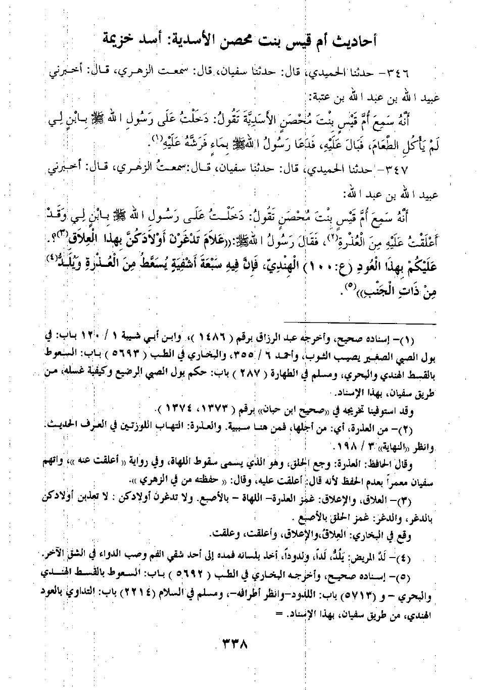 347 - حَدَّثَنَا الْحُمَيْدِيُّ قَالَ: ثنا سُفْيَانُ قَالَ سَمِعْتُ الزُّهْرِيَّ قَالَ: أَخْبَرَنِي عُبَيْدُ اللَّهِ بْنُ عَبْدِ اللَّهِ أَنَّهُ سَمِعَ أُمَّ قَيْسٍ بِنْتِ مُحْصَنٍ تَقُولُ: دَخَلْتُ عَلَى رَسُولِ اللَّهِ صَلَّى اللهُ عَلَيْهِ وَسَلَّمَ بِابْنٍ لِي وَقَدْ أَعْلَقْتُ عَلَيْهِ مِنَ الْعُذْرَةِ فَقَالَ رَسُولُ اللَّهِ صَلَّى اللهُ عَلَيْهِ وَسَلَّمَ: «§عَلَى مَا تَدْغُرْنَ أَوْلَادَكُنَّ بِهَذَا الْعَلَاقِ؟ عَلَيْكُمْ بِهَذَا الْعُودِ الْهِنْدِيِّ، فَإِنَّ فِيهِ سَبْعَةَ أَشْفِيَةٍ يُسَعَّطُ مِنَ الْعُذْرَةِ، وَيَلَدُّ مِنْ ذَاتِ الْجَنْبِ» -[339]- قَالَ الزُّهْرِيُّ: فَسَّرَ لَنَا عُبَيْدُ اللَّهِ اثْنَيْنِ وَلَمْ يُفَسِّرْ لَنَا خَمْسَةً قَالَ الْحُمَيْدِيُّ: الْعُودُ الْهِنْدِيُّ هُوَ الْقُسْطُ