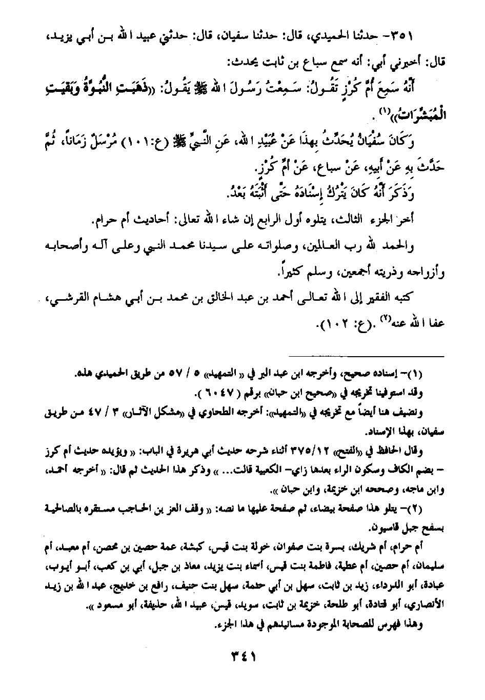 351 - حَدَّثَنَا الْحُمَيْدِيُّ قَالَ: ثنا سُفْيَانُ قَالَ: ثَنِي عُبَيْدُ اللَّهِ بْنُ أَبِي يَزِيدَ قَالَ: أَخْبَرَنِي أَبِي أَنَّهُ سَمِعَ سِبَاعَ بْنَ ثَابِتٍ يُحَدَّثُ: أَنَّهُ سَمِعَ أُمَّ كُرْزٍ تَقُولُ: سَمِعْتُ رَسُولَ اللَّهِ صَلَّى اللهُ عَلَيْهِ وَسَلَّمَ يَقُولُ: «§ذَهَبَتِ النُّبُوَّةُ وَبَقِيَتِ الْمُبَشِّرَاتُ» وَكَانَ سُفْيَانُ يُحَدَّثُ بِهَذَا عَنْ عُبَيْدِ اللَّهِ عَنِ النَّبِيِّ صَلَّى اللهُ عَلَيْهِ وَسَلَّمَ مُرْسَلًا زَمَانًا، ثُمَّ حَدَّثَ بِهِ عَنْ أَبِيهِ عَنْ سِبَاعٍ، عَنْ أُمَّ كُرْزٍ وَذَكَرَ أَنَّهُ كَانَ يَتْرُكُ إِسْنَادَهَ حَتَّى أَثْبَتَهُ بَعْدُ