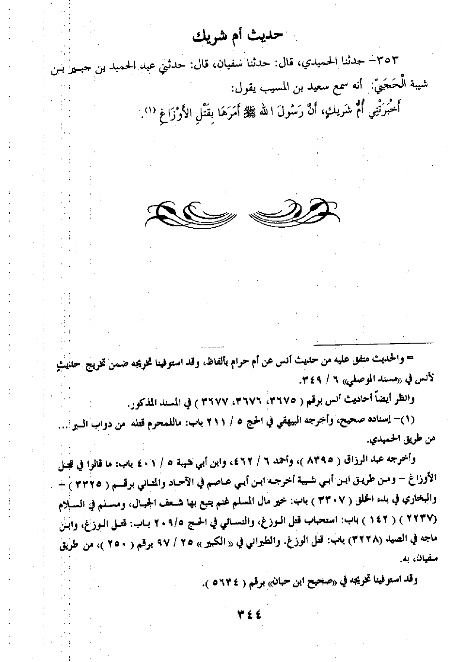 353 - حَدَّثَنَا الْحُمَيْدِيُّ قَالَ: ثنا سُفْيَانُ قَالَ: ثَنِي عَبْدُ الْحَمِيدِ بْنُ جُبَيْرِ بْنِ شَيْبَةَ الْحَجَبِيُّ أَنَّهُ سَمِعَ سَعِيدَ بْنَ الْمُسَيِّبِ يَقُولُ: أَخْبَرَتْنِي أُمُّ شَرِيكٍ أَنَّ رَسُولَ اللَّهِ صَلَّى اللهُ عَلَيْهِ وَسَلَّمَ «§أَمَرَهَا بِقَتْلِ الْأَوْزَاغِ»