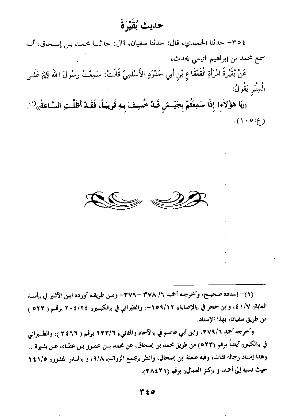 354 - حَدَّثَنَا الْحُمَيْدِيُّ قَالَ: ثنا سُفْيَانُ قَالَ: ثنا مُحَمَّدُ بْنُ إِسْحَاقَ أَنَّهُ سَمِعَ مُحَمَّدَ بْنَ إِبْرَاهِيمَ التَّيْمِيَّ يُحَدِّثُ عَنْ بَقِيرَةَ امْرَأَةِ الْقَعْقَاعِ بْنِ أَبِي حَدْرَدٍ الْأَسْلَمِيِّ قَالَتْ: سَمِعْتُ رَسُولَ اللَّهِ صَلَّى اللهُ عَلَيْهِ وَسَلَّمَ عَلَى الْمِنْبَرِ يَقُولُ: «يَا هَؤُلَاءِ §إِذَا سَمِعْتُمْ بِجَيْشٍ قَدْ خُسِفَ بِهِ قَرِيبًا فَقَدْ أَظَلَّتِ السَّاعَةُ»