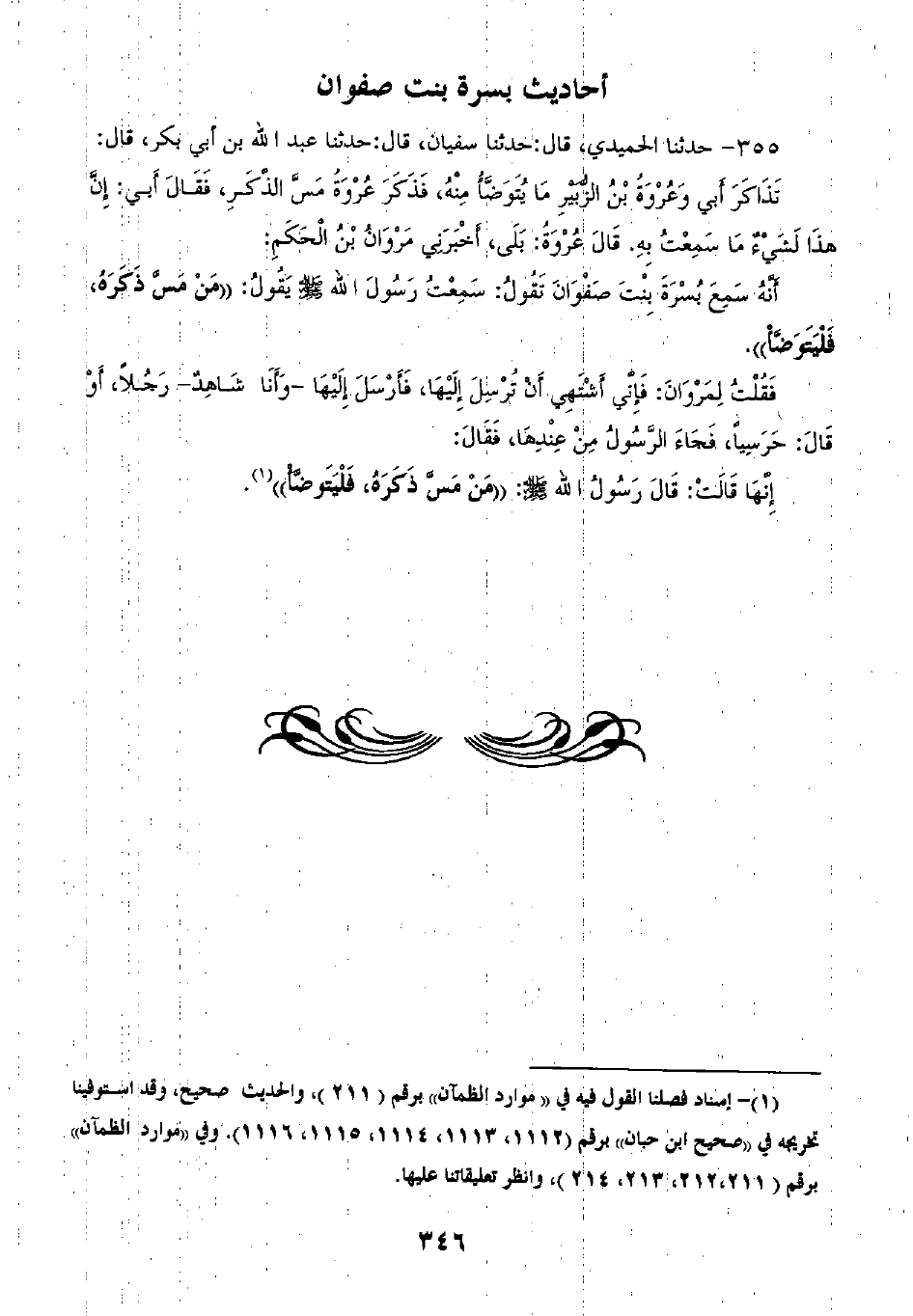 355 - حَدَّثَنَا الْحُمَيْدِيُّ قَالَ: ثنا سُفْيَانُ قَالَ: ثنا عَبْدُ اللَّهِ بْنُ أَبِي بَكْرٍ قَالَ: تَذَاكَرَ أَبِي وَعُرْوَةُ بْنُ الزُّبَيْرِ مَا يُتَوَضَّأُ مِنْهُ، فَذَكَرَ عُرْوَةُ مَسَّ الذَّكَرِ، فَقَالَ أَبِي: إِنَّ هَذَا لَشَيْءٌ مَا سَمِعْتُ بِهِ قَالَ عُرْوَةُ: بَلَى، أَخْبَرَنِي مَرْوَانُ بْنُ الْحَكَمِ أَنَّهُ سَمِعَ بُسْرَةَ بِنْتَ صَفْوَانَ تَقُولُ: سَمِعْتُ رَسُولَ اللَّهِ صَلَّى اللهُ عَلَيْهِ وَسَلَّمَ: «§مَنْ مَسَّ ذَكَرَهُ فَلْيَتَوَضَّأْ» فَقُلْتُ لِمَرْوَانَ فَإِنِّي أَشْتَهِي أَنْ تُرْسِلَ إِلَيْهَا، فَأَرْسَلَ إِلَيْهَا، وَأَنَا شَاهِدٌ رَجُلًا، أَوْ قَالَ حَرَسِيٍّ فَجَاءَ الرَّسُولُ مِنْ عِنْدِهَا فَقَالَ: إِنَّهَا قَالَتْ: قَالَ رَسُولُ اللَّهِ صَلَّى اللهُ عَلَيْهِ وَسَلَّمَ: «مَنْ مَسَّ ذَكَرَهُ فَلْيَتَوَضَّأْ»