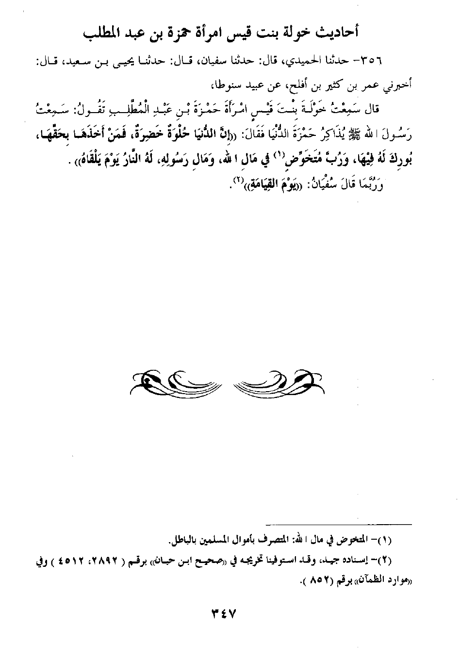 356 - حَدَّثَنَا الْحُمَيْدِيُّ قَالَ: ثنا سُفْيَانُ قَالَ: ثنا يَحْيَى بْنُ سَعِيدٍ قَالَ: أَخْبَرَنِي عُمَرُ بْنُ كَثِيرِ بْنِ أَفْلَحَ، عَنْ عُبَيْدٍ سَنُوطَا قَالَ: سَمِعْتُ خَوْلَةَ بِنْتَ قَيْسٍ امْرَأَةَ حَمْزَةَ بْنِ عَبْدِ الْمُطَّلِبِ تَقُولُ: سَمِعْتُ رَسُولَ اللَّهِ صَلَّى اللهُ عَلَيْهِ وَسَلَّمَ يُذَاكِرُ حَمْزَةَ الدُّنْيَا فَقَالَ: «§إِنَّ الدُّنْيَا حُلْوَةٌ خَضِرَةٌ فَإِنْ أَخَذَهَا بِحَقِّهَا بُورِكَ لَهُ فِيهَا، وَرُبَّ مَتَخَوِّضٍ فِي مَالِ اللَّهِ وَمَالِ رَسُولِهِ لَهُ النَّارُ يَوْمَ يَلْقَاهُ» وَرُبَّمَا قَالَ سُفْيَانُ «يَوْمَ الْقِيَامَةِ»