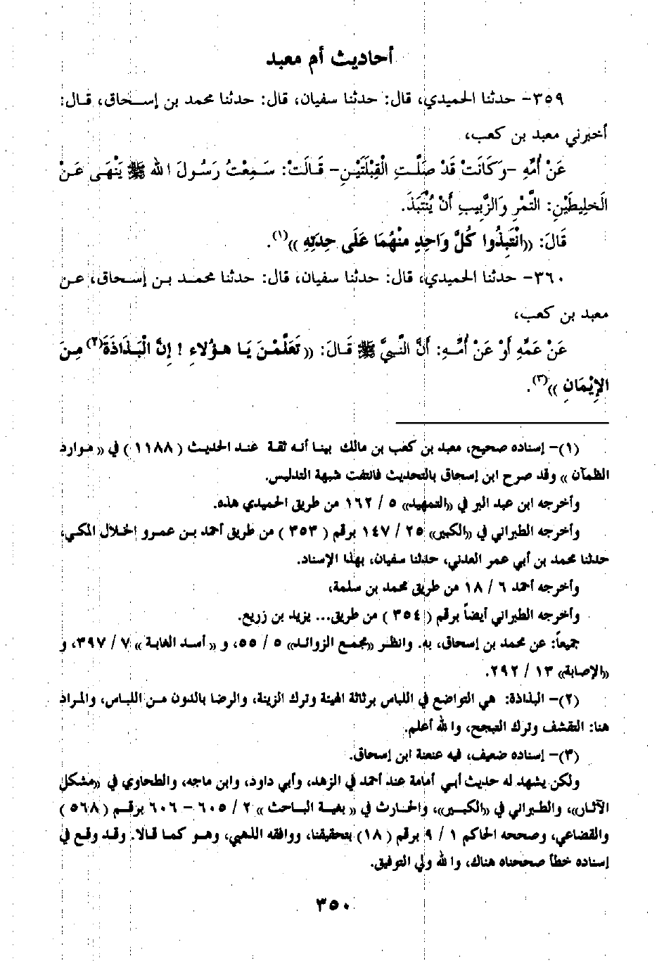 360 - حَدَّثَنَا الْحُمَيْدِيُّ قَالَ: ثنا سُفْيَانُ قَالَ: ثنا مُحَمَّدُ بْنُ إِسْحَاقَ، عَنْ مَعْبَدِ بْنِ كَعْبٍ، عَنْ عَمِّهِ أَوْ عَنْ أُمِّهِ، أَنَّ النَّبِيَّ صَلَّى اللهُ عَلَيْهِ وَسَلَّمَ قَالَ: «تَعَلَّمْنَ يَا هَؤُلَاءِ أَنَّ §الْبَذَاذَةَ مِنَ الْإِيمَانِ»