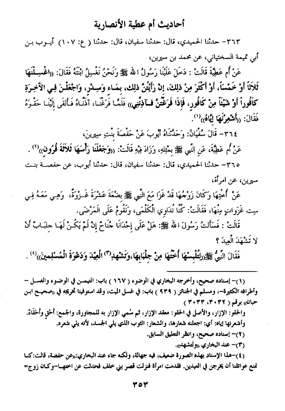 363 - حَدَّثَنَا الْحُمَيْدِيُّ قَالَ: ثنا سُفْيَانُ قَالَ: ثنا أَيُّوبُ بْنُ أَبِي تَمِيمَةَ السِّخْتِيَانِيُّ، عَنْ مُحَمَّدِ بْنِ سِيرِينَ، عَنْ أُمِّ عَطِيَّةَ قَالَتْ: دَخَلَ عَلَيْنَا رَسُولُ اللَّهِ صَلَّى اللهُ عَلَيْهِ وَسَلَّمَ وَنَحْنُ نُغَسِّلُ ابْنَتَهُ فَقَالَ: «§اغْسِلْنَهَا ثَلَاثًا أَوْ خَمْسًا، أَوْ أَكْثَرَ مِنْ ذَلِكَ إِنْ رَأَيْتُنَّ ذَلِكَ بِمَاءٍ وَسِدْرٍ وَاجْعَلْنَ فِي الْآخِرَةِ كَافُورًا، أَوْ شَيْئًا مِنْ كَافُورٍ فَإِذَا فَرَغْتُنَّ فَآذِنَّنِي» فَلَمَّا فَرَغْنَا آذَنَّاهُ، فَأَلْقَى إِلَيْنَا حِقْوَهُ فَقَالَ: «أَشْعِرْنَهَا إِيَّاهُ»