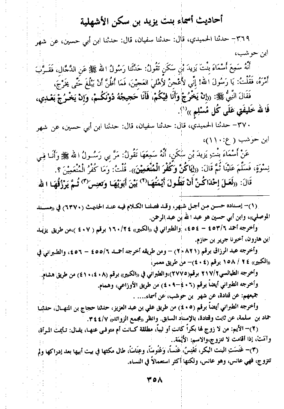 369 - حَدَّثَنَا الْحُمَيْدِيُّ قَالَ: ثنا سُفْيَانُ قَالَ: ثنا ابْنُ أَبِي حُسَيْنٍ، عَنْ شَهْرِ بْنِ حَوْشَبٍ أَنَّهُ سَمِعَ أَسْمَاءَ بِنْتَ يَزِيدَ بْنِ سَكَنٍ تَقُولُ: حَدَّثَنَا رَسُولُ اللَّهِ صَلَّى اللهُ عَلَيْهِ وَسَلَّمَ عَنِ الدَّجَّالِ فَقَرَّبَ أَمْرَهُ، فَقُلْتُ: يَا رَسُولَ اللَّهِ إِنِّي لَأَعْجِنُ لِأَهْلِيَ الْعَجِينَ فَمَا أَظُنُّ أَنْ يَبْلُغَ حَتَّى يَخْرُجَ، فَقَالَ النَّبِيُّ صَلَّى اللهُ عَلَيْهِ وَسَلَّمَ: «§إِنْ يَخْرُجْ وَأَنَا فِيكُمْ فَأَنَا حَجِيجُهُ دُونَكُمْ، وَإِنْ يَخْرُجْ بَعْدِي فَاللَّهُ خَلِيفَتِي عَلَى كُلِّ مُسْلِمٍ»