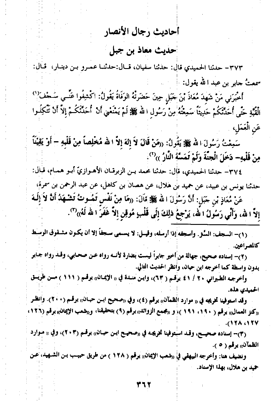 373 - حَدَّثَنَا الْحُمَيْدِيُّ قَالَ: ثنا سُفْيَانُ قَالَ: ثنا عَمْرُو بْنُ دِينَارٍ قَالَ سَمِعْتُ جَابِرَ بْنَ عَبْدِ اللَّهِ يَقُولُ: أَخْبَرَنِي مَنْ شَهِدَ مُعَاذَ بْنَ جَبَلٍ حِينَ حَضَرَتْهُ الْوَفَاةُ، يَقُولُ: اكْشِفُوا عَنِّي سَجْفَ الْقُبَّةِ حَتَّى أُحَدِّثَكُمْ حَدِيثًا سَمِعْتُهُ مِنْ رَسُولِ اللَّهِ صَلَّى اللهُ عَلَيْهِ وَسَلَّمَ لَمْ يَمْنَعْنِي أَنْ أُحَدِّثَكُمْ إِلَّا أَنْ تَتَّكِلُوا عَنِ الْعَمَلِ سَمِعْتُ رَسُولَ اللَّهِ صَلَّى اللهُ عَلَيْهِ وَسَلَّمَ يَقُولُ: «§مَنْ قَالَ لَا إِلَهَ إِلَّا اللَّهُ مُخْلِصًا مِنْ قَلْبِهِ أَوْ يَقِينًا مْنِ قَلْبِهِ دَخَلَ الْجَنَّةَ، وَلَمْ تَمَسَّهُ النَّارَ»