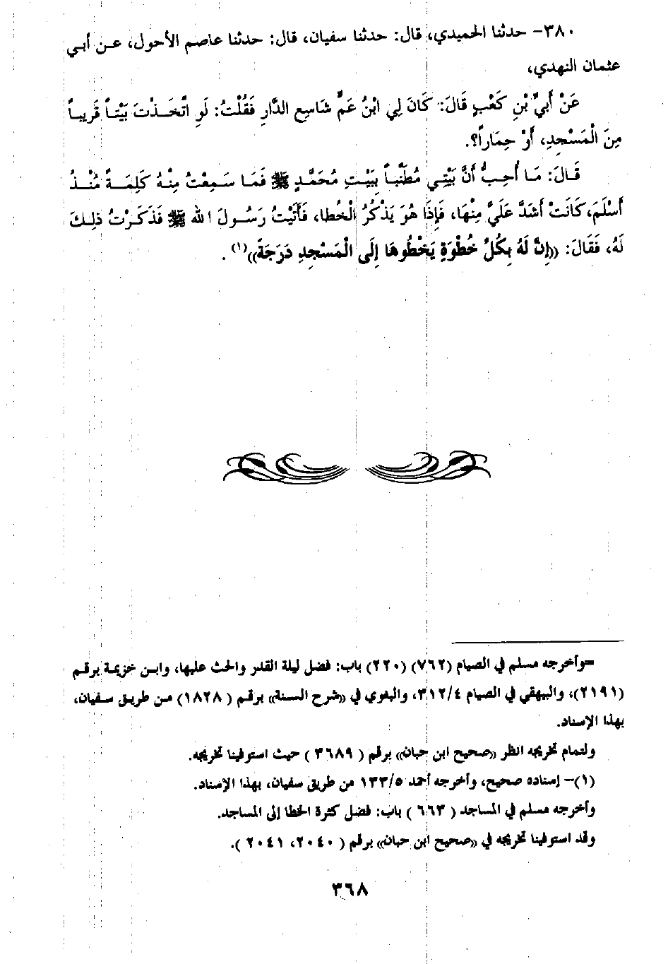 380 - حَدَّثَنَا الْحُمَيْدِيُّ قَالَ: ثنا سُفْيَانُ قَالَ: ثنا عَاصِمٌ الْأَحْوَلُ، عَنْ أَبِي عُثْمَانَ النَّهْدِيِّ، عَنْ أُبَيِّ بْنِ كَعْبٍ قَالَ: كَانَ لِي ابْنُ عَمٍّ شَاسِعُ الدَّارِ فَقُلْتُ: لَوِ اشْتَرَيْتُ بَيْتًا قَرِيبًا مْنَ الْمَسْجِدِ أَوْ حِمَارًا قَالَ: مَا أُحِبُّ أَنَّ بَيْتِيَ مُطْنَبًا بِبَيْتِ مُحَمَّدٍ صَلَّى اللهُ عَلَيْهِ وَسَلَّمَ فَمَا سَمِعْتُ مِنْهُ كَلِمَةً مُنْذُ أَسْلَمَ كَانَتْ أَشَدَّ عَلَيَّ مِنْهَا فَإِذَا هُوَ يَذْكُرُ الْخَطَأَ، فَأَتَيْتُ رَسُولَ اللَّهِ صَلَّى اللهُ عَلَيْهِ وَسَلَّمَ فَذَكَرْتُ ذَلِكَ لَهُ فَقَالَ: «§إِنَّ لَهُ بِكُلِّ خُطْوَةِ يَخْطُوهَا إِلَى الْمَسْجِدِ دَرَجَةً»