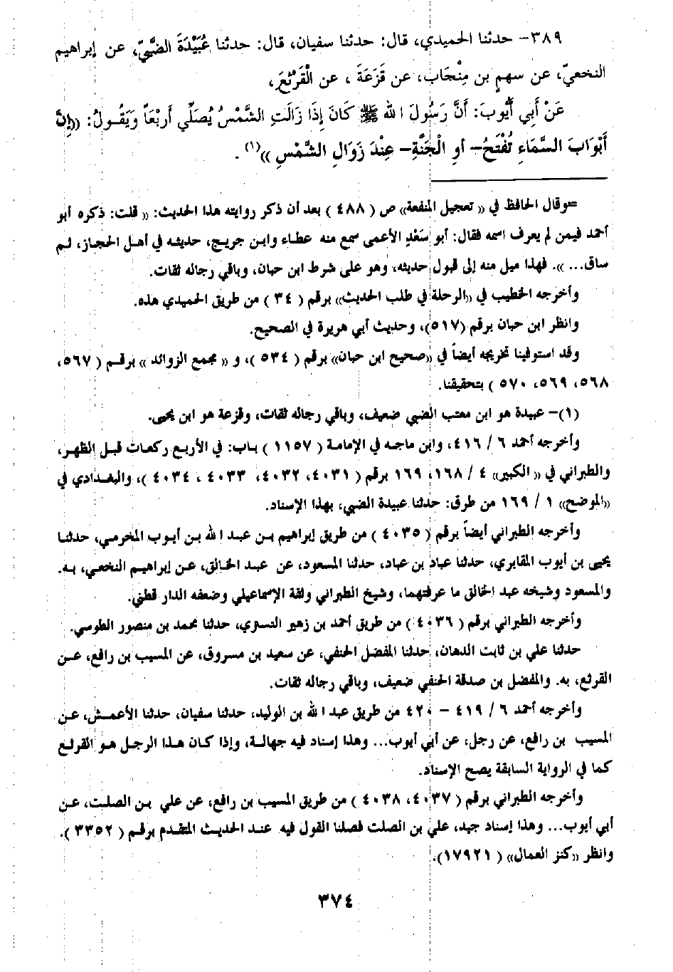 389 - حَدَّثَنَا الْحُمَيْدِيُّ قَالَ: ثنا سُفْيَانُ قَالَ: ثنا عُبَيْدَةُ الضَّبِّيُّ، عَنْ إِبْرَاهِيمَ النَّخَعِيِّ، عَنْ سَهْمِ بْنِ مِنْجَابٍ، عَنْ قَزَعَةَ، عَنِ الْقَرْثَعِ، عَنْ أَبِي أَيُّوبَ أَنَّ رَسُولَ اللَّهِ صَلَّى اللهُ عَلَيْهِ وَسَلَّمَ كَانَ إِذَا زَالَتِ الشَّمْسُ يُصَلِّي أَرْبَعًا وَيَقُولُ: «§إِنَّ أَبْوَابَ السَّمَاءِ تُفْتَحُ أَوِ الْجَنَّةِ عِنْدَ زَوَالِ الشَّمْسِ»