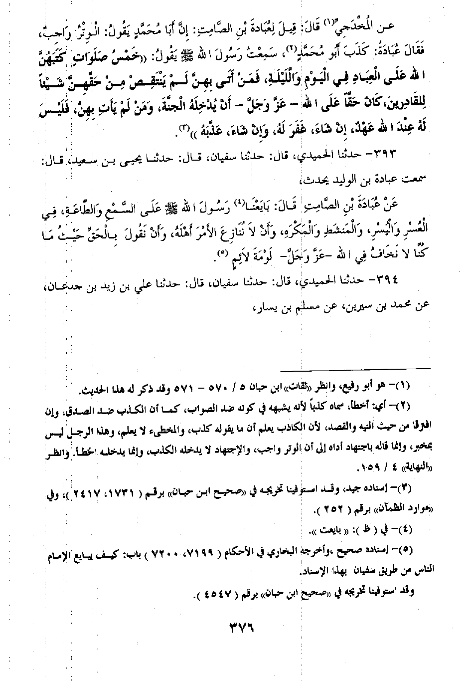 393 - حَدَّثَنَا الْحُمَيْدِيُّ قَالَ: ثنا سُفْيَانُ قَالَ: ثنا يَحْيَى بْنُ سَعِيدٍ قَالَ سَمِعْتُ عُبَادَةَ بْنَ الْوَلِيدِ يُحَدِّثُ عَنْ عُبَادَةَ بْنِ الصَّامِتِ قَالَ: «§بَايَعْنَا رَسُولَ اللَّهِ صَلَّى اللهُ عَلَيْهِ وَسَلَّمَ عَلَى السَّمْعِ وَالطَّاعَةِ فِي الْعُسْرِ وَالَيُسْرِ وَالْمَنْشَطِ وَالْمَكْرَهِ، وَأَنْ لَا نُنَازِعَ الْأَمْرَ أَهْلَهُ، وَأَنْ نَقُولَ بِالْحَقِّ حَيْثُ مَا كُنَّا لَا نَخَافُ فِي اللَّهِ عَزَّ وَجَلَّ لَوْمَةَ لَائِمٍ»