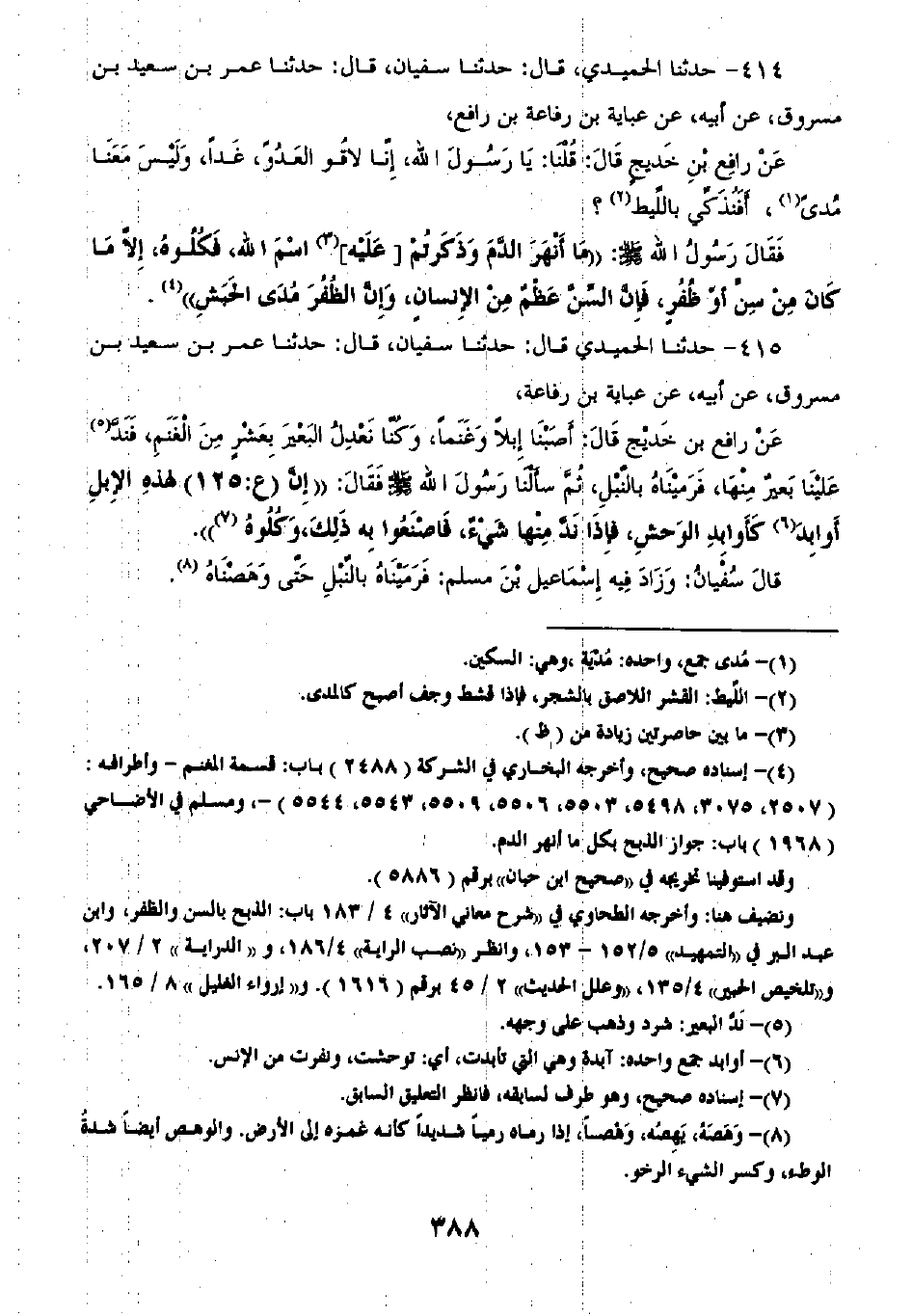 415 - حَدَّثَنَا الْحُمَيْدِيُّ قَالَ: ثنا سُفْيَانُ قَالَ: ثنا عُمَرُ بْنُ سَعِيدِ بْنُ مَسْرُوقٍ، عَنْ أَبِيهِ، عَنْ عَبَايَةَ بْنِ رِفَاعَةَ، عَنْ رَافِعِ بْنِ خَدِيجٍ قَالَ: أَصَبْنَا إِبِلًا وَغَنَمًا، وَكُنَّا نَعْدِلُ الْبَعِيرَ بِعَشْرٍ مِنَ الْغَنَمِ فَنَدَّ عَلَيْنَا بَعِيرٌ مِنْهَا فَرَمَيْنَاهُ بِالنَّبْلِ، ثُمَّ سَأَلْنَا رَسُولَ اللَّهِ صَلَّى اللهُ عَلَيْهِ وَسَلَّمَ فَقَالَ: «§إِنَّ لِهَذِهِ الْإِبِلِ أَوَابِدَ كَأَوَابِدِ الْوَحْشِ فَإِذَا نَدَّ مِنْهَا شَيْءٌ فَاصْنَعُوا بِهِ ذَلِكَ وَكُلُوهُ» قَالَ سُفْيَانُ وَزَادَ فِيهِ إِسْمَاعِيلُ بْنُ مُسْلِمٍ فَرَمَيْنَاهُ بِالنَّبْلِ حَتَّى وَهَصْنَاهُ