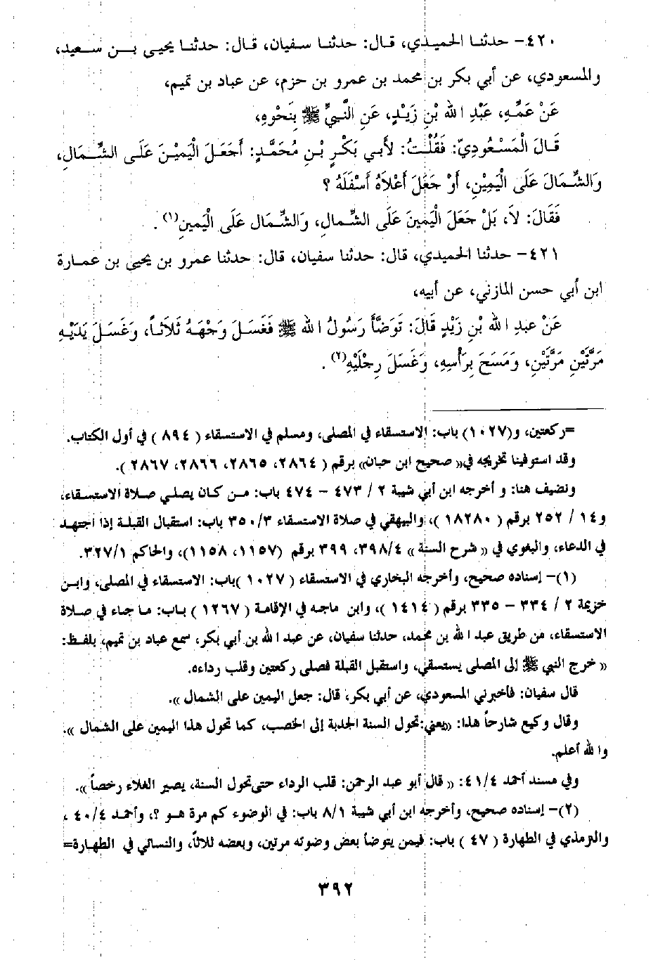 421 - حَدَّثَنَا الْحُمَيْدِيُّ قَالَ: ثنا سُفْيَانُ قَالَ: ثنا عَمْرُو بْنُ يَحْيَى بْنِ عُمَارَةَ بْنِ أَبِي حَسَنٍ الْمَازِنِيِّ، عَنْ أَبِيهِ، عَنْ عَبْدِ اللَّهِ بْنِ زَيْدٍ قَالَ: " تَوَضَّأَ رَسُولُ اللَّهِ صَلَّى اللهُ عَلَيْهِ وَسَلَّمَ: §فَغَسَلَ وَجْهَهُ ثَلَاثًا، وَغَسَلَ يَدَيْهِ مَرَّتَيْنِ مَرَّتَيْنِ، وَمَسَحَ بِرَأْسِهِ، وَغَسَلَ رِجْلَيْهِ "