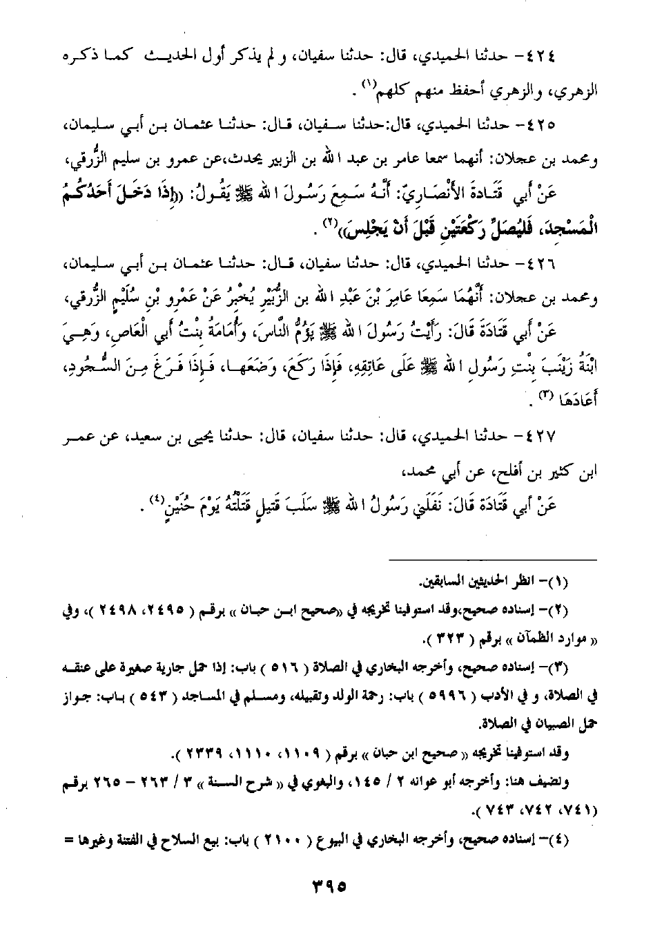 426 - حَدَّثَنَا الْحُمَيْدِيُّ قَالَ: ثنا سُفْيَانُ قَالَ: ثنا عُثْمَانُ بْنُ أَبِي سُلَيْمَانَ، وَمُحَمَّدُ بْنُ عَجْلَانَ أَنَّهُمَا سَمِعَا عَامِرَ بْنَ عَبْدِ اللَّهِ بْنِ الزُّبَيْرِ يُخْبِرُ عَنْ عَمْرِو بْنِ سُلَيْمٍ الزُّرَقِيِّ، عَنْ أَبِي قَتَادَةَ قَالَ: «رَأَيْتُ رَسُولَ اللَّهِ صَلَّى اللهُ عَلَيْهِ وَسَلَّمَ يَؤُمُّ النَّاسَ وَأُمَامَةُ بِنْتُ الْعَاصِ وَهِيَ ابْنَةُ زَيْنَبَ بِنْتِ رَسُولِ اللَّهِ صَلَّى اللهُ عَلَيْهِ وَسَلَّمَ عَلَى عَاتِقِهِ §فَإِذَا رَكَعَ وَضَعَهَا فَإِذَا فَرَغَ مِنَ السُّجُودِ أَعَادَهَا»