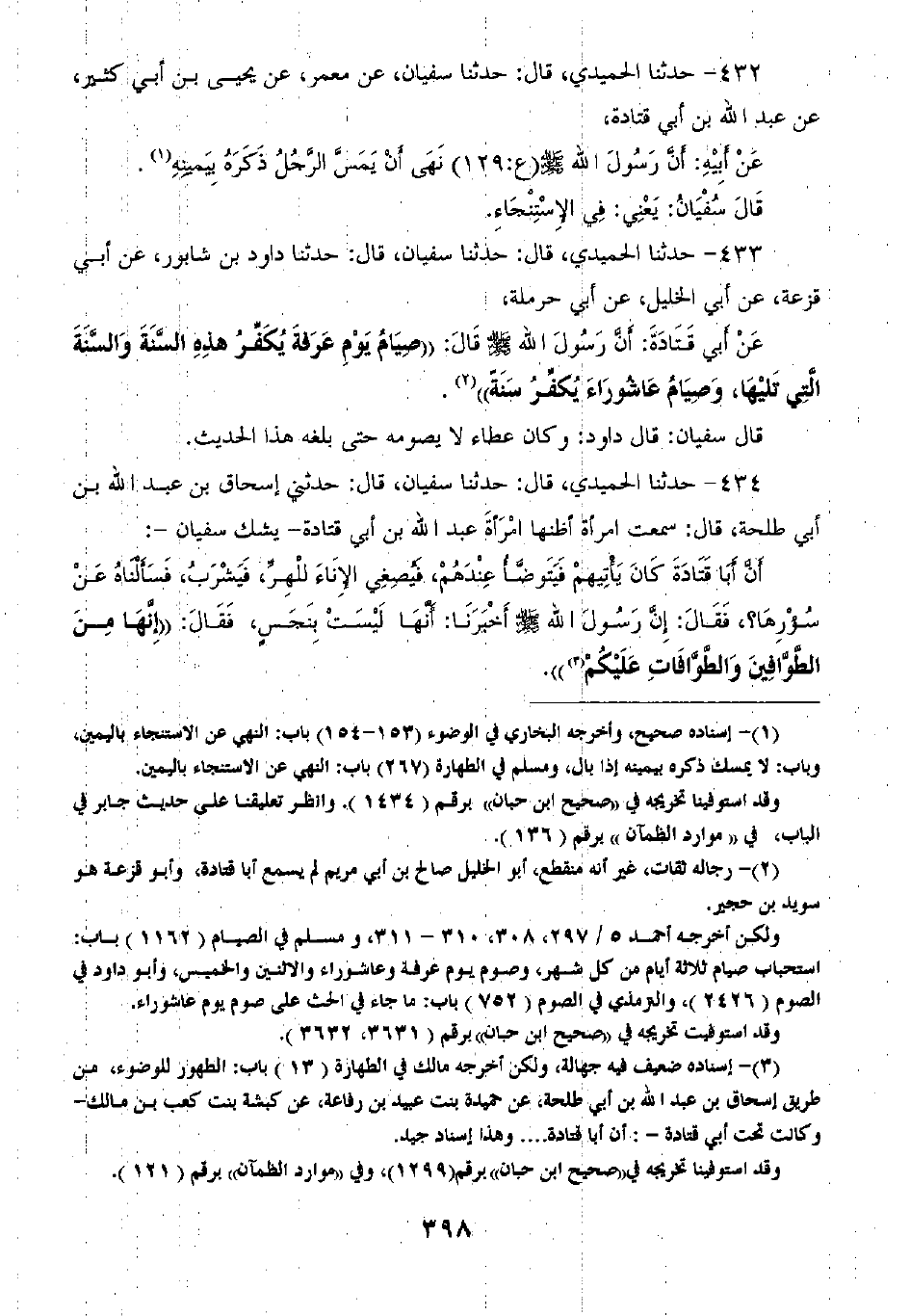 432 - حَدَّثَنَا الْحُمَيْدِيُّ قَالَ: ثنا سُفْيَانُ، عَنْ مَعْمَرٍ، عَنْ يَحْيَى بْنِ أَبِي كَثِيرٍ، عَنْ عَبْدِ اللَّهِ بْنِ أَبِي قَتَادَةَ، عَنْ أَبِيهِ، «أَنَّ رَسُولَ اللَّهِ صَلَّى اللهُ عَلَيْهِ وَسَلَّمَ §نَهَى أَنْ يَمَسَّ الرَّجُلُ ذَكَرَهُ بِيَمِينِهِ» قَالَ سُفْيَانُ يَعْنِي فِي الَاسْتِنْجَاءِ