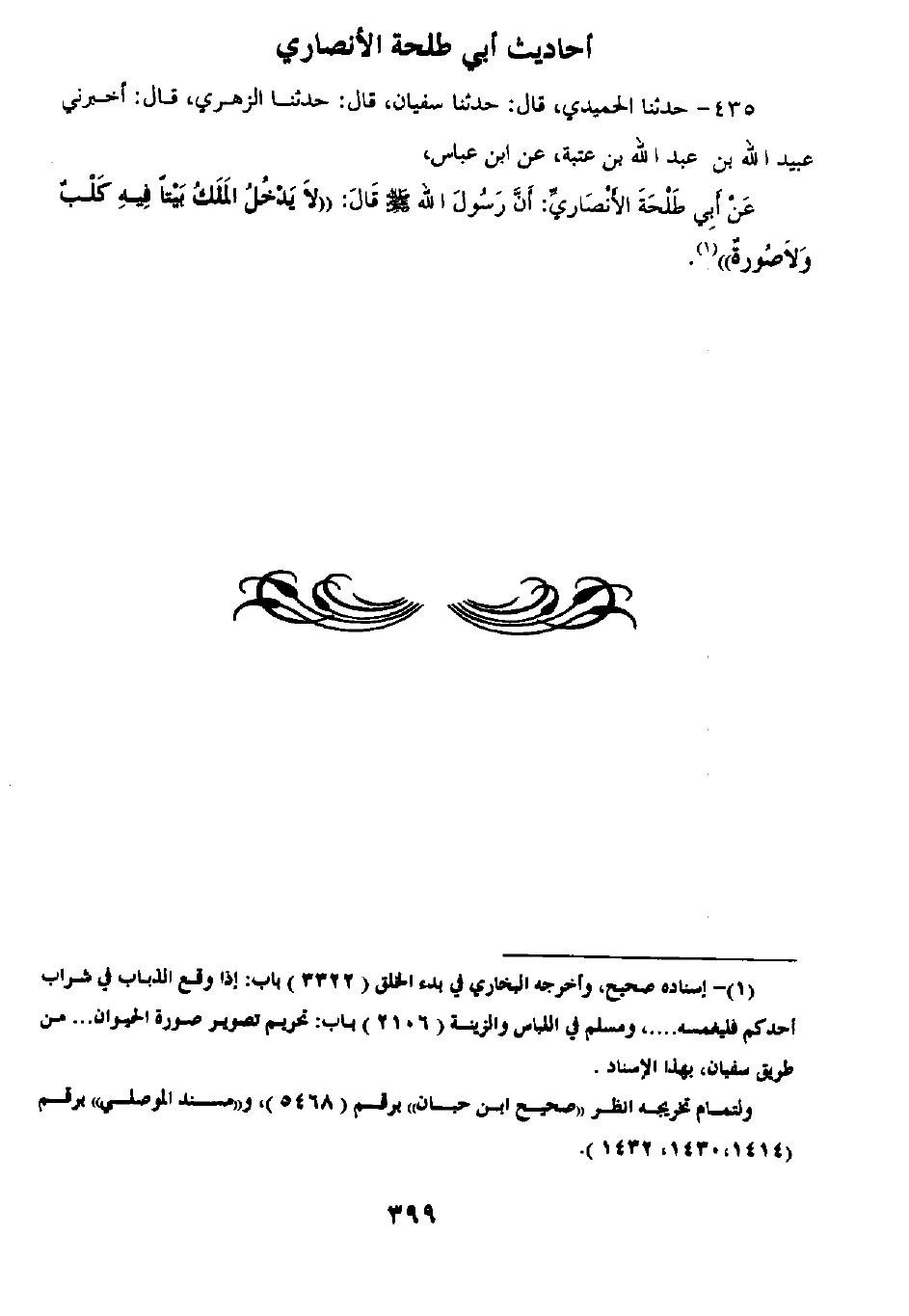 435 - حَدَّثَنَا الْحُمَيْدِيُّ قَالَ: ثنا سُفْيَانُ قَالَ: ثنا الزُّهْرِيُّ قَالَ: أَخْبَرَنِي عُبَيْدُ اللَّهِ بْنُ عَبْدِ اللَّهِ بْنِ عُتْبَةَ، عَنِ ابْنِ عَبَّاسٍ، عَنْ أَبِي طَلْحَةَ الْأَنْصَارِيِّ أَنَّ رَسُولَ اللَّهِ صَلَّى اللهُ عَلَيْهِ وَسَلَّمَ قَالَ: «§لَا يَدْخُلُ الْمَلَكُ بَيْتًا فِيهِ كَلْبٌ وَلَا صُورَةٌ»