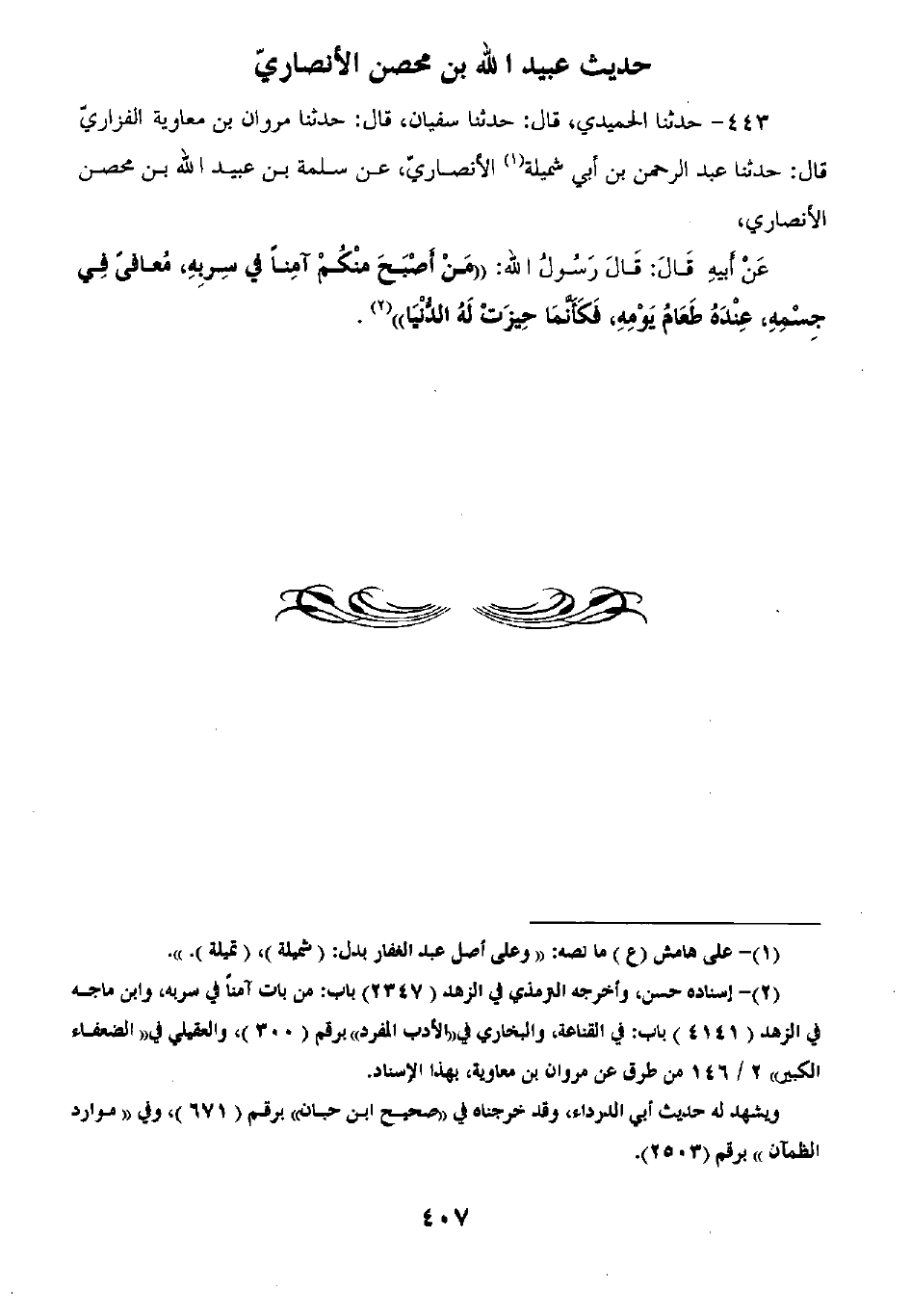 443 - حَدَّثَنَا الْحُمَيْدِيُّ قَالَ: ثنا مَرْوَانُ بْنُ مُعَاوِيَةَ الْفَزَارِيُّ قَالَ: ثنا عَبْدُ الرَّحْمَنِ بْنُ أَبِي شُمَيْلَةَ الْأَنْصَارِيُّ، عَنْ سَلَمَةَ بْنِ عُبَيْدِ اللَّهِ بْنِ مُحْصَنٍ الْأَنْصَارِيِّ، عَنْ أَبِيهِ قَالَ: قَالَ رَسُولُ اللَّهِ صَلَّى اللهُ عَلَيْهِ وَسَلَّمَ: «§مَنْ أَصْبَحَ مِنْكُمْ آمِنًا فِي سِرْبِهِ مُعَافًا فِي جِسْمِهِ عِنْدَهُ طَعَامُ يَوْمِهِ فَكَأَنَّمَا حِيزَتْ لَهُ الدُّنْيَا»
