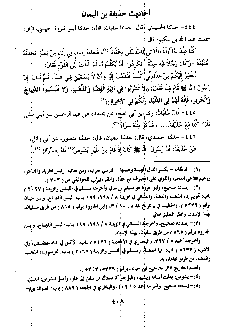 444 - حَدَّثَنَا الْحُمَيْدِيُّ قَالَ: ثنا سُفْيَانُ قَالَ: ثنا أَبُو فَرْوَةَ الْجُهَنِيُّ قَالَ سَمِعْتُ عَبْدَ اللَّهِ بْنَ عُكَيْمٍ قَالَ: كُنَّا عِنْدَ حُذَيْفَةَ بِالْمَدَائِنِ فَاسْتَسْقَى دَهْقَانًا فَجَاءَهُ بِمَاءٍ فِي إِنَاءٍ مِنْ فِضَّةٍ فَحَذَفَهُ حُذَيْفَةُ وَكَانَ رَجُلًا فِيهِ حِدَّةٌ، فَكَرِهُوا أَنْ يُكَلِّمُوهُ، ثُمَّ الْتَفَتَ إِلَى الْقَوْمِ فَقَالَ أَعْتَذِرُ إِلَيْكُمْ مِنْ هَذَا؛ إِنِّي كُنْتُ تَقَدَّمْتُ إِلَيْهِ أَنْ لَا يَسْقِيَنِي فِي هَذَا ثُمَّ قَالَ إِنَّ رَسُولَ اللَّهِ صَلَّى اللهُ عَلَيْهِ وَسَلَّمَ قَامَ فِينَا فَقَالَ: «§لَا تَشْرَبُوا فِي آنِيَةِ الْفِضَّةِ وَالذَّهَبِ، وَلَا تَلْبَسُوا الدِّيبَاجَ وَالْحَرِيرَ؛ فَإِنَّهُ لَهُمْ فِي الدُّنْيَا وَلَكُمْ فِي الْآخِرَةِ»