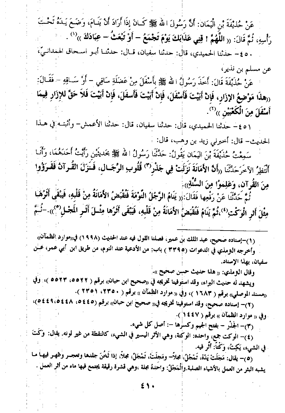 451 - حَدَّثَنَا الْحُمَيْدِيُّ قَالَ: ثنا سُفْيَانُ قَالَ: ثنا الْأَعْمَشُ وَأَثْبَتُّهُ فِي هَذَا الْحَدِيثِ قَالَ: أَخْبَرَنِي زَيْدُ بْنُ وَهْبٍ قَالَ: سَمِعْتُ حُذَيْفَةَ بْنَ الْيَمَانِ يَقُولُ: حَدَّثَنَا رَسُولُ اللَّهِ صَلَّى اللهُ عَلَيْهِ وَسَلَّمَ بِحَدِيثَيْنِ رَأَيْتُ أَحَدَهُمَا وَأَنَا أَنْتَظِرُ لِلْآخَرِ حَدَّثَنَا «§أَنَّ الْأَمَانَةَ نَزَلَتْ فِي جِذْرِ قُلُوبِ الرِّجَالِ» فَنَزَلَ الْقُرْآنُ فَقَرَءُوا مِنَ الْقُرْآنِ، وَعَلِمُوا مِنَ السُّنَّةِ، ثُمَّ حَدَّثَنَا عَنْ رَفْعِهَا، فَقَالَ «يَنَامُ الرَّجُلُ النَّوْمَةَ فَتُقْبَضُ الْأَمَانَةُ مِنْ قَلْبِهِ فَيَبْقَى أَثَرُهَا مِثْلَ أَثَرِ الْمَجْلِ ثُمَّ أَخَذَ حَصَيَاتٍ فَقَالَ بِهِنَّ عَلَى رِجْلِهِ فَدَحْرَجَهُنَّ فَقَالَ دَحْرَجْتُهُ فَنَفِطَ فَتَرَاهُ مُنْتَبِرًا وَلَيْسَ فِيهِ شَيْءٌ، وَيَظَلُّ النَّاسُ يَتَبَايَعُونَ لَيْسَ فِيهِمْ رَجُلٌ يُؤَدِّي الْأَمَانَةَ، وَحَتَّى يُقَالَ لِلرَّجُلِ مَا أَجْلَدَهُ وَمَا أَظْرَفَهُ وَمَا أَعْقَلَهُ وَمَا فِي قَلْبِهِ مِثْقَالَ حَبَّةٍ مِنْ خَرْدَلٍ مِنْ إِيمَانٍ، وَلَقَدْ رَأَيْتُنِي وَمَا أُبَالِي أَيُّكُمْ بَايَعْتُ لَئِنْ كَانَ مُسْلِمًا لَيُرَدَّنَّهُ عَلَيَّ إِسْلَامُهُ، وَإِنْ كَانَ يَهُودِيًّا أَوْ نَصْرَانِيًّا لَيُرَدَّنَّ عَلَيَّ سَاعِيهِ وَمَا أُبَايِعُ الْيَوْمَ إِلَّا فُلَانًا أَوْ فُلَانًا»