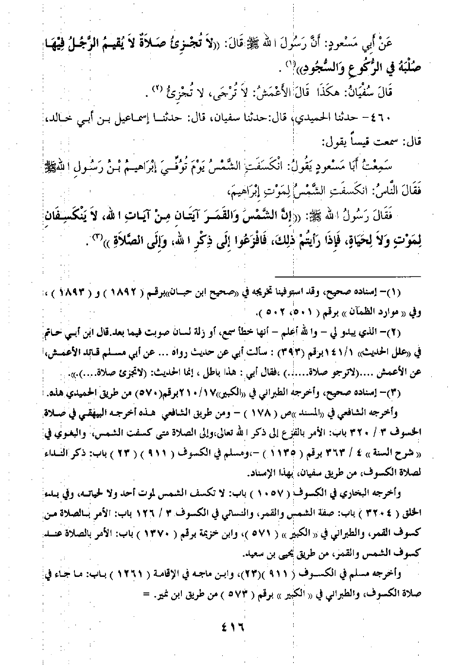 460 - حَدَّثَنَا الْحُمَيْدِيُّ قَالَ: ثنا سُفْيَانُ قَالَ: ثنا إِسْمَاعِيلُ بْنُ أَبِي خَالِدٍ قَالَ: سَمِعْتُ قَيْسًا يَقُولُ: سَمِعْتُ أَبَا مَسْعُودٍ يَقُولُ: انْكَسَفَ الشَّمْسُ يَوْمَ تُوُفِّيَ إِبْرَاهِيمُ ابْنُ رَسُولِ اللَّهِ صَلَّى اللهُ عَلَيْهِ وَسَلَّمَ فَقَالَ النَّاسُ انْكَسَفَتِ الشَّمْسُ يَوْمَ مَوْتِ إِبْرَاهِيمَ فَقَالَ رَسُولُ اللَّهِ صَلَّى اللهُ عَلَيْهِ وَسَلَّمَ: «§إِنَّ الشَّمْسَ وَالْقَمَرَ آيَتَانِ مِنْ آيَاتِ اللَّهِ لَا يَنْكَسِفَانِ لِمَوْتٍ وَلَا حَيَاةٍ فَإِذَا رَأَيْتُمْ ذَلِكَ فَافْزَعُوا إِلَى ذِكْرِ اللَّهِ وَإِلَى الصَّلَاةِ»