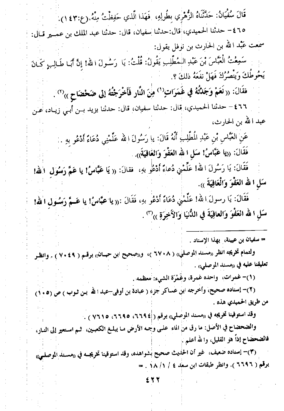 466 - حَدَّثَنَا الْحُمَيْدِيُّ قَالَ: ثنا سُفْيَانُ قَالَ: ثنا يَزِيدُ بْنُ أَبِي زِيَادٍ، عَنْ عَبْدِ اللَّهِ بْنِ الْحَارِثِ، عَنِ الْعَبَّاسِ بْنِ عَبْدِ الْمُطَّلِبِ أَنَّهُ قَالَ: يَا رَسُولَ اللَّهِ عَلِّمْنِي دُعَاءً أَدْعُو بِهِ فَقَالَ: «يَا عَبَّاسُ سَلِ الْعَفْوَ وَالْعَافِيَةَ» فَقَالَ: يَا رَسُولَ اللَّهِ عَلِّمْنِي دُعَاءً أَدْعُو بِهِ فَقَالَ «يَا عَبَّاسُ يَا عَمَّ رَسُولِ اللَّهِ سَلِ اللَّهَ الْعَفْوَ وَالْعَافِيَةَ» فَقَالَ: يَا رَسُولَ اللَّهِ عَلِّمْنِي دُعَاءً أَدْعُو بِهِ فَقَالَ «يَا عَبَّاسُ يَا عَمَّ رَسُولِ اللَّهِ §سَلِ اللَّهَ الْعَفْوَ وَالْعَافِيَةَ فِي الدُّنْيَا وَالْآخِرَةِ» -[423]- قَالَ أَبُو بَكْرٍ الْحُمَيْدِيُّ وَكَانَ سُفْيَانُ رُبَّمَا قَالَ فِي هَذَا الْحَدِيثِ عَنْ عَبْدِ اللَّهِ بْنِ الْحَارِثِ أَنَّ الْعَبَّاسَ قَالَ: يَا رَسُولَ اللَّهِ وَأَكْثَرَ ذَلِكَ يَقُولُ عَنِ الْعَبَّاسِ أَنَّهُ قَالَ: يَا رَسُولَ اللَّهِ