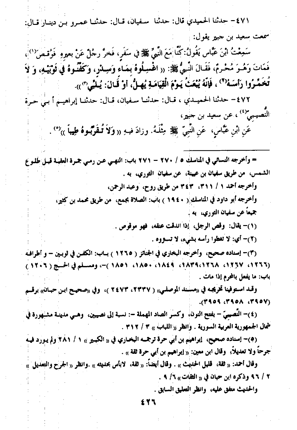 472 - حَدَّثَنَا الْحُمَيْدِيُّ قَالَ: ثنا سُفْيَانُ قَالَ حَدَّثَنَا إِبْرَاهِيمُ بْنُ أَبِي حُرَّةَ النَّصِيبِيُّ، عَنْ سَعِيدِ بْنِ جُبَيْرٍ، عَنِ ابْنِ عَبَّاسٍ عَنِ النَّبِيِّ صَلَّى اللهُ عَلَيْهِ وَسَلَّمَ مِثْلَهُ، وَزَادَ فِيهِ «وَلَا تُقَرِّبُوهُ طِيبًا»