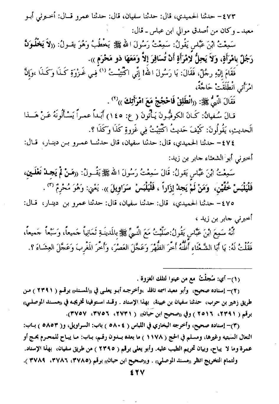 473 - حَدَّثَنَا الْحُمَيْدِيُّ قَالَ: ثنا سُفْيَانُ قَالَ: ثنا عَمْرٌو قَالَ: أَخْبَرَنِي أَبُو مَعْبَدٍ وَكَانَ مِنْ أَصْدَقِ مَوَالِي ابْنِ عَبَّاسٍ قَالَ: سَمِعْتُ ابْنَ عَبَّاسٍ يَقُولُ: سَمِعْتُ رَسُولَ اللَّهِ صَلَّى اللهُ عَلَيْهِ وَسَلَّمَ يَخْطُبُ وَهُوَ يَقُولُ: «§لَا يَخْلُوَنَّ رَجُلٌ بِامْرَأَةٍ وَلَا يَحِلُّ لِامْرَأَةٍ أَنْ تُسَافِرَ إِلَّا وَمَعَهَا ذُو مَحْرَمٍ» فَقَامَ إِلَيْهِ رَجُلٌ فَقَالَ: يَا رَسُولَ اللَّهِ إِنِّي اكْتَتَبْتُ فِي غَزْوَةِ كَذَا وَكَذَا وَإِنَّ امْرَأَتِي انْطَلَقَتْ حَاجَّةً فَقَالَ النَّبِيُّ صَلَّى اللهُ عَلَيْهِ وَسَلَّمَ «انْطَلِقْ فَاحْجُجْ مَعَ امْرَأَتِكَ» قَالَ سُفْيَانُ: كَانَ الْكُوفِيُّونَ يَأْتُونَ أَبَدًا عُمَرَ وَيَسْأَلُونَهُ عَنْ هَذَا الْحَدِيثِ يَقُولُونَ كَيْفَ حَدِيثُ اكْتَتَبْتُ فِي غَزْوَةِ كَذَا وَكَذَا؟