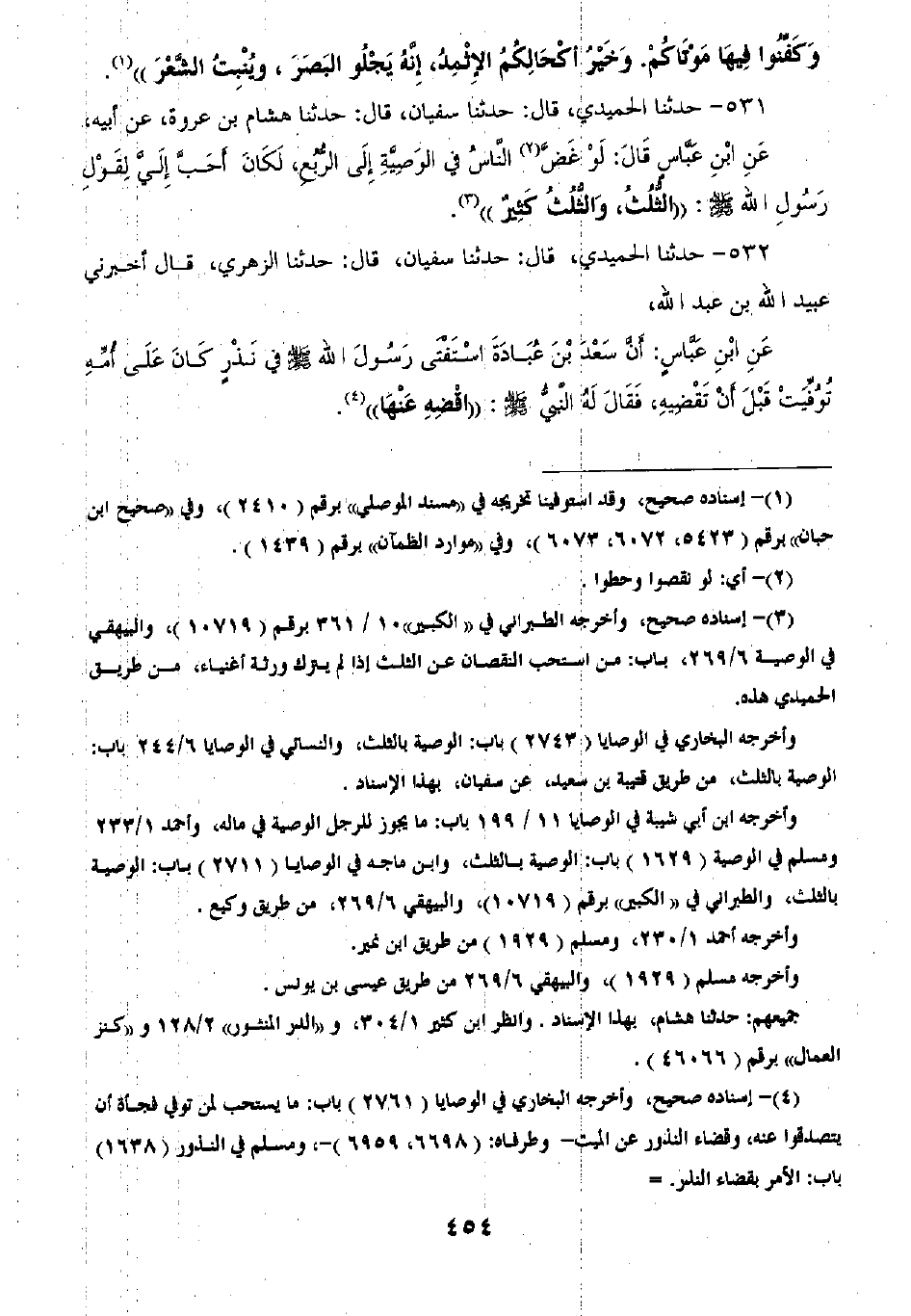 531 - حَدَّثَنَا الْحُمَيْدِيُّ قَالَ: ثنا سُفْيَانُ قَالَ: ثنا هِشَامُ بْنُ عُرْوَةَ، عَنْ أَبِيهِ، عَنِ ابْنِ عَبَّاسٍ قَالَ: لَوْ غَضَّ النَّاسُ فِي الْوَصِيَّةِ إِلَى الرُّبْعِ لَكَانَ أَحَبَّ إِلَيَّ؛ لِقَوْلِ رَسُولِ اللَّهِ صَلَّى اللهُ عَلَيْهِ وَسَلَّمَ: «§الثُّلُثُ وَالثُّلُثُ كَثِيرٌ»