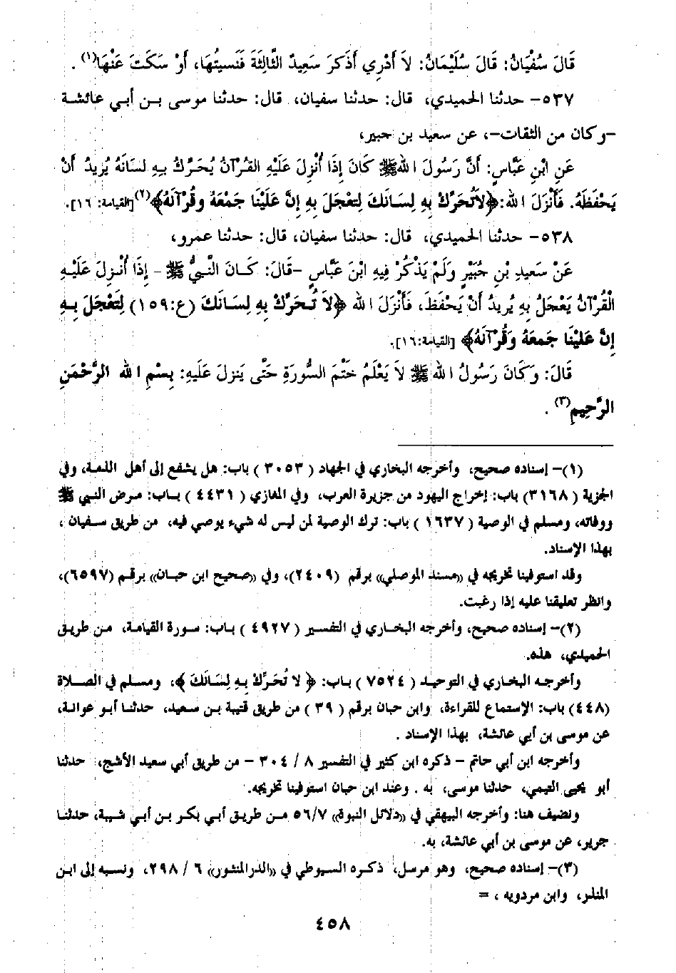 538 - حَدَّثَنَا الْحُمَيْدِيُّ قَالَ: حَدَّثَنَا سُفْيَانُ قَالَ عَمْرٌو: عَنْ سَعِيدِ بْنِ جُبَيْرٍ وَلَمْ يَذْكُرْ فِيهِ عَنِ ابْنِ عَبَّاسٍ قَالَ: " كَانَ النَّبِيُّ صَلَّى اللهُ عَلَيْهِ وَسَلَّمَ §إِذَا أُنْزِلَ عَلَيْهِ الْقُرْآنُ يُعَجِّلُ بِهِ يُرِيدُ أَنْ يَحْفَظَ فَأَنْزَلَ اللَّهُ {لَا تُحَرِّكْ بِهِ لِسَانَكَ لِتَعْجَلَ بِهِ إِنَّ عَلَيْنَا جَمْعَهُ} [القيامة: 17] " الْآيَةَ قَالَ: «وَكَانَ رَسُولُ اللَّهِ صَلَّى اللهُ عَلَيْهِ وَسَلَّمَ لَا يَعْلَمُ خَتْمَ السُّورَةِ حَتَّى يُنْزِلَ عَلَيْهِ (بِسْمِ اللَّهِ الرَّحْمَنِ الرَّحِيمِ) »