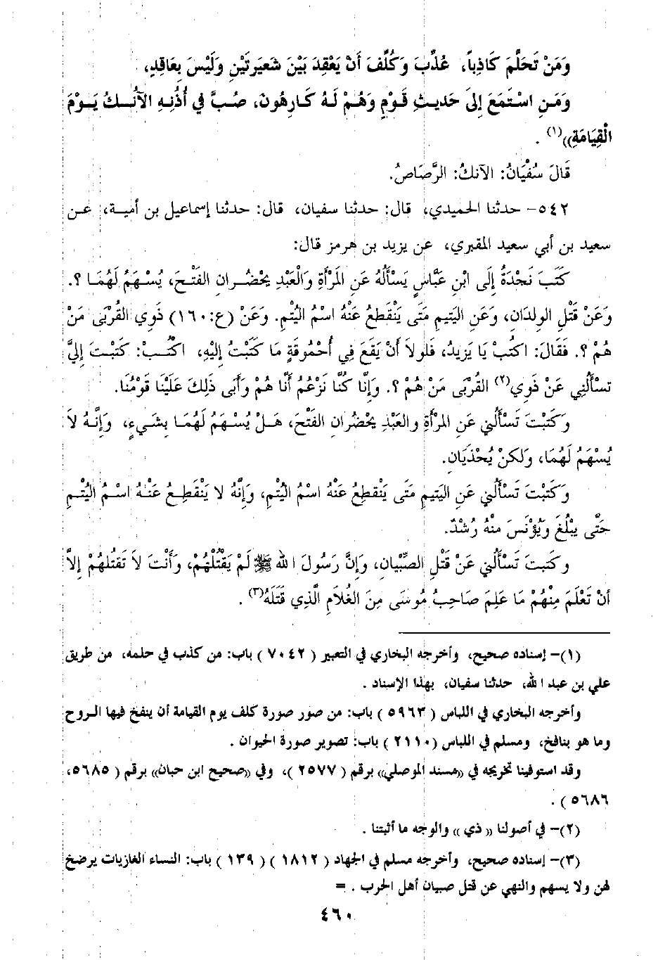542 - حَدَّثَنَا الْحُمَيْدِيُّ قَالَ: ثنا سُفْيَانُ قَالَ: ثنا إِسْمَاعِيلُ بْنُ أُمَيَّةَ، عَنْ سَعِيدِ بْنِ أَبِي سَعِيدٍ الْمَقْبُرِيِّ، عَنْ يَزِيدَ بْنِ هُرْمُزَ قَالَ: كَتَبَ نَجْدَةُ إِلَى ابْنِ عَبَّاسٍ يَسْأَلُهُ عَنِ الْمَرْأَةِ وَالْعَبْدِ يَحْضُرَانِ الْفَتْحَ يُسْهَمْ لَهُمَا؟ وَعَنْ قَتْلِ الْوِلْدَانِ، وَعَنِ الْيَتِيمِ مَتَى يَنْقَطِعُ عَنْهُ اسْمُ الْيَتِيمِ؟ وَعَنْ ذَوِي الْقُرْبَى مَنْ هُمْ؟ فَقَالَ: اكْتُبِ يَا يَزِيدُ فَلَوْلَا أَنْ يَقَعَ فِي أُحْمُوقَةٍ مَا كَتَبْتُ إِلَيْهِ، كَتَبْتَ إِلَيَّ تَسْأَلُنِي عَنْ ذَوِي الْقُرْبَى مَنْ هُمْ؟ وَإِنَّا كُنَّا نَزْعُمُ أَنَّا هُمْ وَأَبَى ذَلِكَ عَلَيْنَا قَوْمُنَا، وَكَتَبْتَ تَسْأَلُنِي عَنِ الْمَرْأَةِ وَالْعَبْدِ يَحْضُرَانِ الْفَتْحَ هَلْ يُسْهَمُ لَهُمَا بِشَيْءٍ؟ وَإِنَّهُ لَا يُسْهَمُ لَهُمَا، وَلَكِنْ يُحْذَيَانِ وَكَتَبْتَ تَسْأَلُنِي عَنِ الْيَتِيمِ مَتَى يَنْقَطِعُ عَنْهُ اسْمُ الْيَتِيمِ؟ وَأَنَّهُ لَا يَنْقَطِعُ عَنْهُ اسْمُ الْيَتِيمِ حَتَّى يَبْلُغَ وَيُؤْنَسَ مِنْهُ رُشْدٌ، وَكَتَبْتَ تَسْأَلُنِي عَنْ قَتْلِ الصِّبْيَانِ «§وَإِنَّ رَسُولَ اللَّهِ صَلَّى اللهُ عَلَيْهِ وَسَلَّمَ لَمْ يَقْتُلْهُمْ وَأَنْتَ لَا تَقْتُلْهُمْ» إِلَّا أَنْ تَعْلَمَ مِنْهُمْ مَا عَلِمَ صَاحِبُ مُوسَى مِنَ الْغُلَامِ الَّذِي قَتَلَهُ