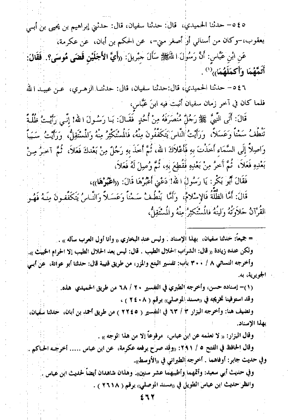 545 - حَدَّثَنَا الْحُمَيْدِيُّ قَالَ: ثنا سُفْيَانُ قَالَ: ثَنِي إِبْرَاهِيمُ بْنُ يَحْيَى بْنِ أَبِي يَعْقُوبَ وَكَانَ مِنْ أَسْنَانِي أَوْ أَصْغَرَ مِنِّي، عَنِ الْحَكَمِ بْنِ أَبَانَ، عَنْ عِكْرِمَةَ، عَنِ ابْنِ عَبَّاسٍ " أَنَّ رَسُولَ اللَّهِ صَلَّى اللهُ عَلَيْهِ وَسَلَّمَ سَأَلَ جِبْرِيلَ §أَيُّ الْأَجَلَيْنِ قَضَى مُوسَى؟ فَقَالَ: أَتَمَّهُمَا وَأَكْمَلَهُمَا "