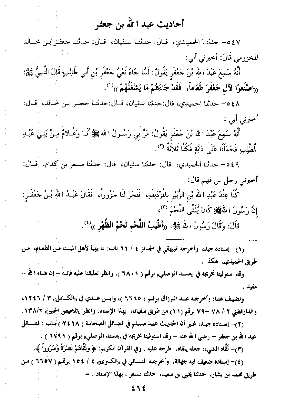 547 - حَدَّثَنَا الْحُمَيْدِيُّ قَالَ: ثنا سُفْيَانُ قَالَ: ثنا جَعْفَرُ بْنُ خَالِدٍ الْمَخْزُومِيُّ قَالَ: أَخْبَرَنِي أَبِي أَنَّهُ سَمِعَ عَبْدَ اللَّهِ بْنَ جَعْفَرٍ يَقُولُ: لَمَّا جَاءَ نَعِيُّ جَعْفَرِ بْنِ أَبِي طَالِبٍ قَالَ النَّبِيَّ صَلَّى اللهُ عَلَيْهِ وَسَلَّمَ: «§اصْنَعُوا لِآلِ جَعْفَرٍ طَعَامًا؛ فَقَدْ جَاءَهُمْ مَا يَشْغَلُهُمْ»