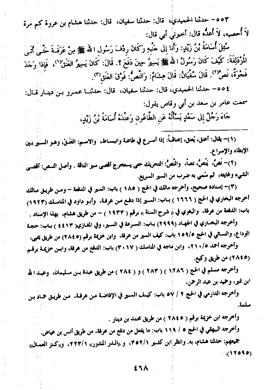 553 - حَدَّثَنَا الْحُمَيْدِيُّ قَالَ: ثنا سُفْيَانُ قَالَ: ثنا هِشَامُ بْنُ عُرْوَةَ كَمْ مَرَّةٍ لَا أُحْصِيهِ لَا أَعُدُّهُ قَالَ: أَخْبَرَنِي أَبِي قَالَ: سُئِلَ أُسَامَةُ بْنُ زَيْدٍ وَأَنَا إِلَى جَنْبِهِ وَكَانَ رِدْفَ رَسُولِ اللَّهِ صَلَّى اللهُ عَلَيْهِ وَسَلَّمَ مِنْ عَرَفَةَ حَتَّى أَتَى الْمُزْدَلِفَةَ كَيْفَ كَانَ رَسُولُ اللَّهِ صَلَّى اللهُ عَلَيْهِ وَسَلَّمَ يَسِيرُ حِينَ دَفَعَ؟ قَالَ «§كَانَ يَسِيرُ الْعَنَقَ؟ فَإِذَا وَجَدَ فَجْوَةً نَصَّ» قَالَ سُفْيَانُ قَالَ هِشَامٌ «وَالنَّصُّ فَوْقَ الْعَنَقِ»
