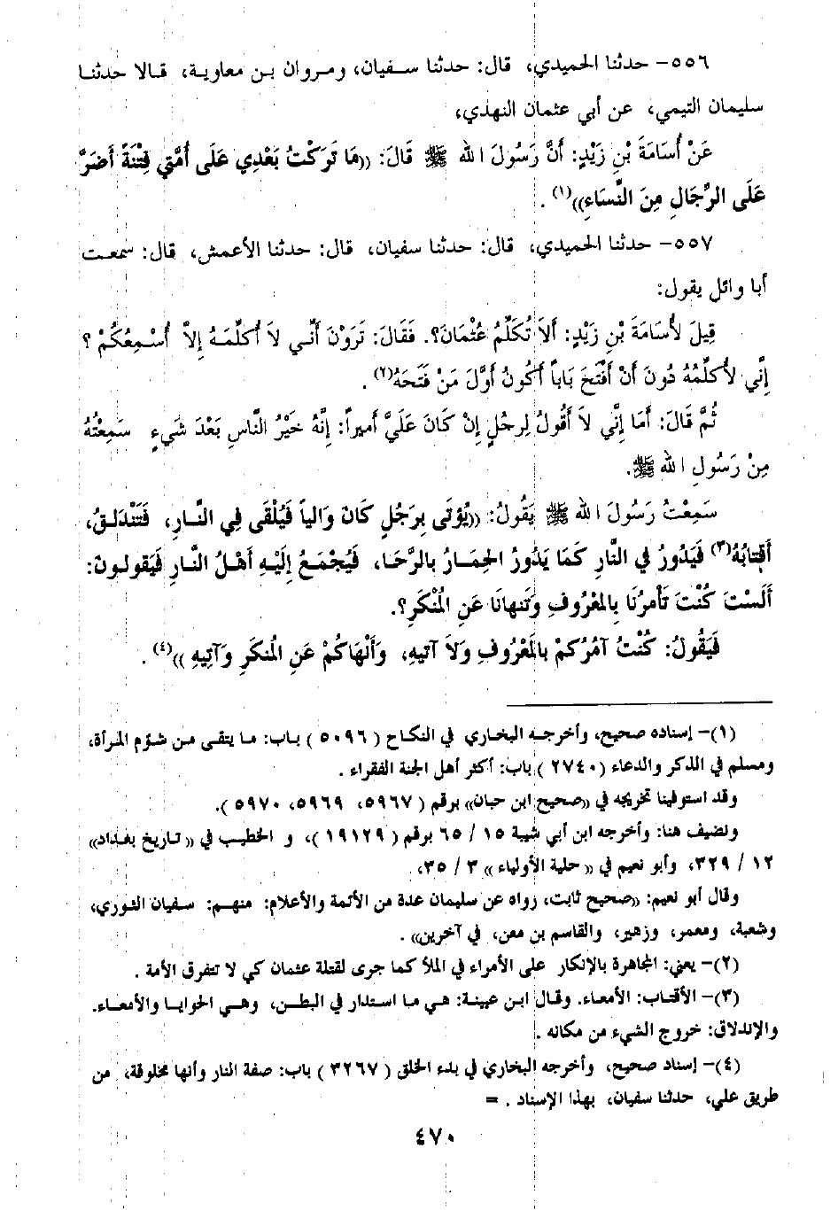 557 - حَدَّثَنَا الْحُمَيْدِيُّ قَالَ: ثنا سُفْيَانُ قَالَ: ثنا الْأَعْمَشُ قَالَ: سَمِعْتُ أَبَا وَائِلٍ يَقُولُ: قِيلَ لِأُسَامَةَ بْنِ زَيْدٍ أَلَا تُكَلِّمُ عُثْمَانَ؟ فَقَالَ: تَرَوْنَ أَنِّي لَا أُكَلِّمُهُ إِلَّا أَسْمَعَكُمْ؟ إِنِّي لَأُكَلِّمُهُ دُونَ أَنْ أَفْتَحَ بَابًا أَكُونُ أَوَّلَ مَنْ فَتَحَهُ، ثُمَّ قَالَ: أَمَا إِنِّي لَا أَقُولُ لِرَجُلٍ إِنْ كَانَ عَلَيَّ أَمِيرًا أَنَّهُ خَيْرُ النَّاسِ بَعْدَ شَيْءٍ سَمِعْتُ مِنْ رَسُولِ اللَّهِ صَلَّى اللهُ عَلَيْهِ وَسَلَّمَ، سَمِعْتُ رَسُولَ اللَّهِ صَلَّى اللهُ عَلَيْهِ وَسَلَّمَ يَقُولُ: " §يُؤْتَى بِرَجُلٍ كَانَ وَالِيًا فَيُلْقَى فِي النَّارِ فَتَنْدَلِقُ أَقْتَابُهُ فَيَدُورُ فِي النَّارِ كَمَا يَدُورُ الْحِمَارُ بِالرَّحَا، فَيُجْمَعُ إِلَيْهِ أَهْلُ النَّارِ فَيَقُولُونَ: أَلَسْتَ كُنْتَ تَأْمُرُ بِالْمَعْرُوفِ، وَتَنْهَانَا عَنِ الْمُنْكَرِ؟ فَيَقُولُ: كُنْتُ آمُرُكُمْ بِالْمَعْرُوفِ وَلَا آتِيهِ، وَأَنْهَاكُمْ عَنِ الْمُنْكَرِ وَآتِيهِ "