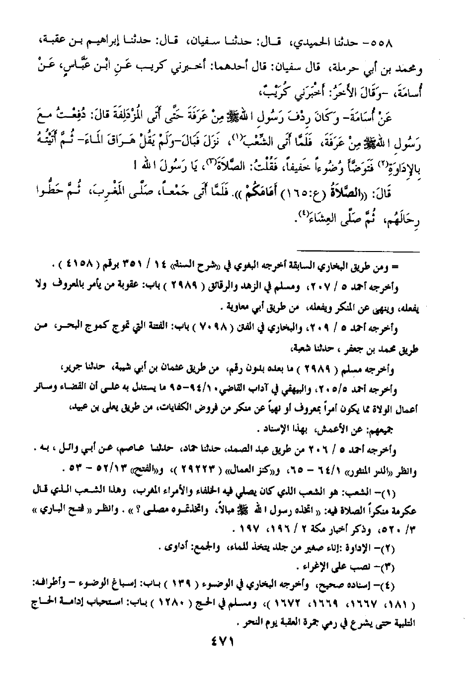 558 - حَدَّثَنَا الْحُمَيْدِيُّ قَالَ: ثنا سُفْيَانُ قَالَ: ثنا إِبْرَاهِيمُ بْنُ عُقْبَةَ، وَمُحَمَّدُ بْنُ أَبِي حَرْمَلَةَ قَالَ سُفْيَانُ قَالَ أَحَدُهُمَا أَخْبَرَنِي كُرَيْبٌ، عَنِ ابْنِ عَبَّاسٍ، عَنْ أُسَامَةَ وَقَالَ الْآخَرُ: أَخْبَرَنِي كُرَيْبٌ، عَنْ أُسَامَةَ وَكَانَ رِدْفَ رَسُولِ اللَّهِ صَلَّى اللهُ عَلَيْهِ وَسَلَّمَ مِنْ عَرَفَةَ حَتَّى أَتَى الْمُزْدَلِفَةَ قَالَ: «دَفَعْتُ مَعَ رَسُولِ اللَّهِ صَلَّى اللهُ عَلَيْهِ وَسَلَّمَ مِنْ عَرَفَةَ فَلَمَّا أَتَى الشِّعْبَ نَزَلَ؟ فَبَالَ وَلَمْ يَقُلْ هَرَاقِ الْمَاءَ، ثُمَّ آتَيْتُهُ بِالْإِدَاوَةِ فَتَوَضَّأَ وَضُوءًا خَفِيفًا؟» فَقُلْتُ الصَّلَاةَ يَا رَسُولَ اللَّهِ؟ قَالَ: «§الصَّلَاةُ أَمَامَكُمْ فَلَمَّا أَتَى جَمْعًا صَلَّى صَلَاةَ الْمَغْرِبِ ثُمَّ حَطُّوا رِحَالَهُمْ ثُمَّ صَلَّى الْعِشَاءَ» -[472]- قَالَ سُفْيَانُ: " لَمْ يَخْتَلِفْ إِبْرَاهِيمُ بْنُ عُقْبَةَ وَمُحَمَّدٌ فِي شَيْءٍ مِنْ هَذَا الْحَدِيثِ إِلَّا أَنَّ ذَا قَالَ كُرَيْبٌ عَنْ أُسَامَةَ وَقَالَ: هَذَا كُرَيْبٌ عَنِ ابْنِ عَبَّاسٍ عَنْ أُسَامَةَ "