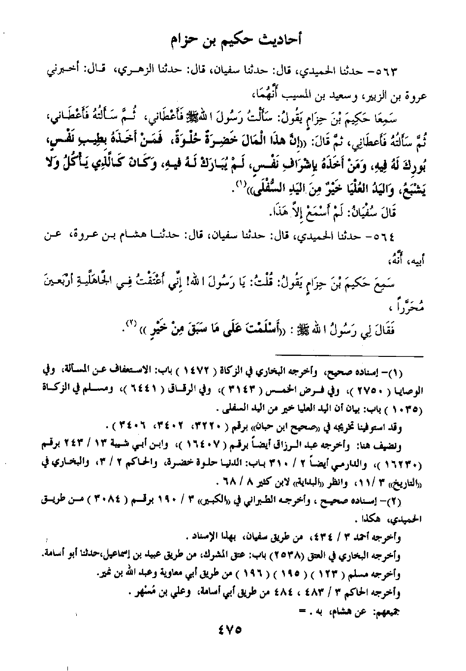 563 - حَدَّثَنَا الْحُمَيْدِيُّ قَالَ: ثنا سُفْيَانُ قَالَ: ثنا الزُّهْرِيُّ قَالَ: أَخْبَرَنِي عُرْوَةُ بْنُ الزُّبَيْرِ، وَسَعِيدُ بْنُ الْمُسَيِّبِ أَنَّهُمَا سَمِعَا حَكِيمَ بْنَ حِزَامٍ يَقُولُ: سَأَلْتُ رَسُولَ اللَّهِ صَلَّى اللهُ عَلَيْهِ وَسَلَّمَ فَأَعْطَانِي ثُمَّ سَأَلْتُهُ فَأَعْطَانِي ثُمَّ سَأَلْتُهُ فَأَعْطَانِي ثُمَّ قَالَ: «إِنَّ هَذَا §الْمَالَ خَضِرَةٌ حُلْوَةٌ فَمَنْ أَخَذَهُ بِطِيبِ نَفْسٍ بُورِكَ لَهُ فِيهِ، وَمَنْ أَخَذَهُ بِإِشْرَافِ نَفْسٍ لَمْ يُبَارَكْ لَهُ فِيهِ، وَكَانَ كَالَّذِي يَأْكُلُ وَلَا يَشْبَعُ، وَالْيَدُ الْعُلْيَا خَيْرٌ مِنَ الْيَدِ السُّفْلَى» قَالَ سُفْيَانُ: لَمْ أَسْمَعْ إِلَّا هَذَا