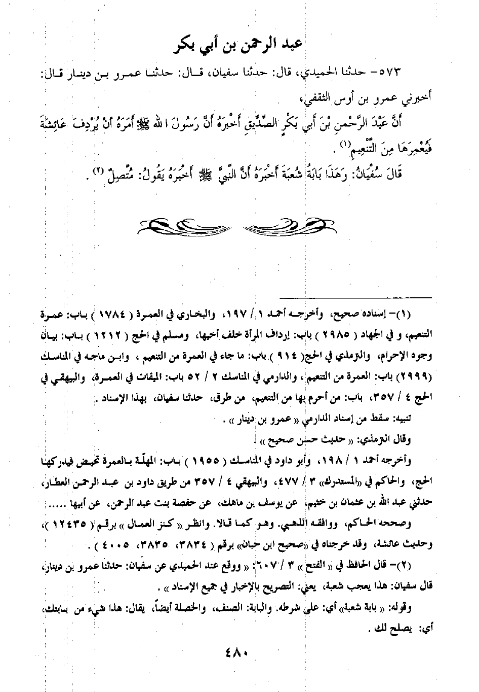 573 - حَدَّثَنَا الْحُمَيْدِيُّ قَالَ: ثنا سُفْيَانُ قَالَ: ثنا عَمْرُو بْنُ دِينَارٍ قَالَ: أَخْبَرَنِي عَمْرُو بْنُ أَوْسٍ الثَّقَفِيُّ، أَنَّ عَبْدَ الرَّحْمَنِ بْنَ أَبِي بَكْرٍ الصِّدِّيقِ أَخْبَرَهُ «أَنَّ رَسُولَ اللَّهِ صَلَّى اللهُ عَلَيْهِ وَسَلَّمَ §أَمَرَهُ أَنْ يُرْدِفَ عَائِشَةَ فَيُعْمِرُهَا مِنَ التَّنْعِيمِ» قَالَ سُفْيَانُ: وَهَذَا بَابُهُ شُعْبَةُ أَخْبَرَهُ أَنَّ النَّبِيَّ صَلَّى اللهُ عَلَيْهِ وَسَلَّمَ أَخْبَرَهُ يَقُولُ: مُتَّصِلٌ