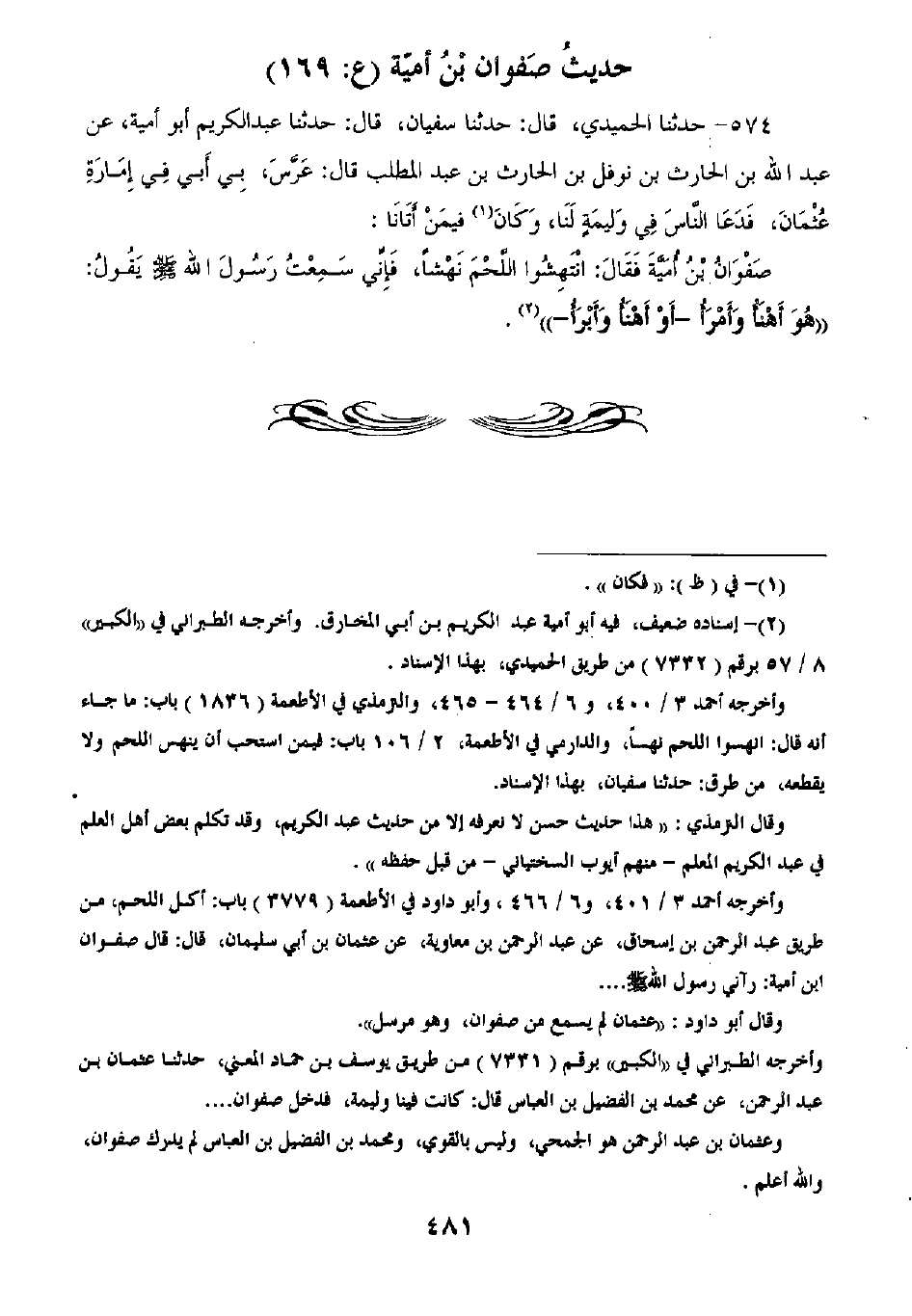 574 - حَدَّثَنَا الْحُمَيْدِيُّ قَالَ: ثنا سُفْيَانُ قَالَ: ثنا عَبْدُ الْكَرِيمِ أَبُو أُمَيَّةَ، عَنْ عَبْدِ اللَّهِ بْنِ الْحَارِثِ بْنِ نَوْفَلِ بْنِ الْحَارِثِ بْنِ عَبْدِ الْمُطَّلِبِ قَالَ: عَرَّسَ بِي أَبِي فِي إِمَارَةِ عُثْمَانَ فَدَعَا النَّاسَ فِي وَلِيمَةٍ لَنَا، وَكَانَ فِيمَنْ أَتَانَا صَفْوَانُ بْنُ أُمَيَّةَ فَقَالَ: انْتَهِشُوا اللَّحْمَ نَهْشًا فَإِنِّي سَمِعْتُ رَسُولَ اللَّهِ صَلَّى اللهُ عَلَيْهِ وَسَلَّمَ يَقُولُ: «§هُوَ أَهْنَأُ وَأَمْرَأُ أَوْ أَهْنَأُ وَأَبْرَأُ»