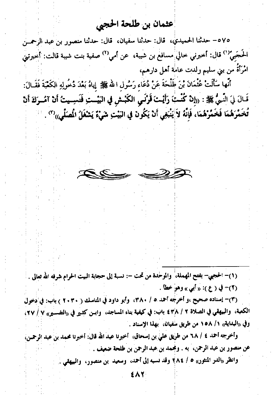 575 - حَدَّثَنَا الْحُمَيْدِيُّ قَالَ: ثنا سُفْيَانُ قَالَ: ثنا مَنْصُورُ بْنُ عَبْدِ الرَّحْمَنِ الْحَجَبِيُّ قَالَ: أَخْبَرَنِي خَالِي مُسَافِعُ بْنُ شَيْبَةَ عَنْ أُمِّي صَفِيَّةَ بِنْتِ شَيْبَةَ قَالَتْ: أَخْبَرَتْنِي امْرَأَةٌ مِنْ بَنِي سُلَيْمٍ وَلَدَتْ عَامَّةَ أَهْلِ دَارِهِمْ أَنَّهَا سَأَلَتْ عُثْمَانَ بْنَ طَلْحَةَ عَنْ دُعَاءِ رَسُولِ اللَّهِ صَلَّى اللهُ عَلَيْهِ وَسَلَّمَ إِيَّاهُ بَعْدَ دُخُولِهِ الْكَعْبَةَ فَقَالَ: قَالَ لِي النَّبِيُّ صَلَّى اللهُ عَلَيْهِ وَسَلَّمَ «إِنْ كُنْتُ رَأَيْتُ قَرْنَيِ الْكَبْشِ فِي الْبَيْتِ فَنَسِيتُ أَنْ آمُرَكَ أَنْ تُخَمِّرَهُمَا فَخَمِّرْهُمَا فَإِنَّهُ §لَا يَنْبَغِي أَنْ يَكُونَ فِي الْبَيْتِ شَيْءٌ يَشْغَلُ الْمُصَلِّي»