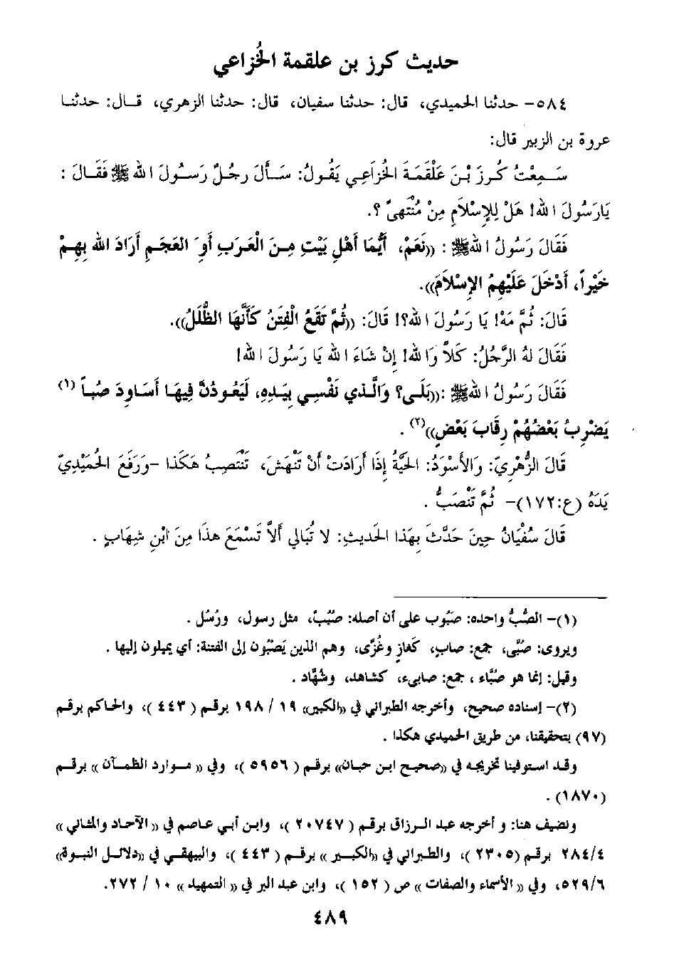 584 - حَدَّثَنَا الْحُمَيْدِيُّ قَالَ: ثنا سُفْيَانُ قَالَ: ثنا الزُّهْرِيُّ قَالَ: ثنا عُرْوَةُ بْنُ الزُّبَيْرِ قَالَ: سَمِعْتُ كُرْزَ بْنَ عَلْقَمَةَ الْخُزَاعِيَّ يَقُولُ: سَأَلَ رَجُلٌ رَسُولَ اللَّهِ صَلَّى اللهُ عَلَيْهِ وَسَلَّمَ فَقَالَ: يَا رَسُولَ اللَّهِ هَلْ لِلْإِسْلَامِ مِنْ مُنْتَهًى؟ فَقَالَ رَسُولُ اللَّهِ صَلَّى اللهُ عَلَيْهِ وَسَلَّمَ: «نَعَمْ §أَيُّمَا أَهْلِ بَيْتٍ مِنَ الْعَرَبِ أَوِ الْعَجَمِ أَرَادَ اللَّهُ بِهِمْ خَيْرًا أَدْخَلَ عَلَيْهِمُ الْإِسْلَامَ» قَالَ: ثُمَّ مَهْ يَا رَسُولَ اللَّهِ قَالَ: «ثُمَّ تَقَعُ الْفِتَنُ كَأَنَّهَا الظُّلَلُ» فَقَالَ لَهُ الرَّجُلُ: كَلَّا وَاللَّهِ إِنْ شَاءَ اللَّهُ يَا رَسُولَ اللَّهِ فَقَالَ رَسُولُ اللَّهِ صَلَّى اللهُ عَلَيْهِ وَسَلَّمَ: «بَلَى وَالَّذِي نَفْسِي بِيَدِهِ لَيَعُودُنَّ فِيهَا أَسَاوِدَ صُبًّا يَضْرِبُ بَعْضُهُمْ رِقَابَ بَعْضٍ» قَالَ الزُّهْرِيُّ «وَالْأَسْوَدُ الْحَيَّةُ إِذَا أَرَادَتْ أَنْ تَنْهَشَ تَنْتَصِبُ هَكَذَا» وَرَفَعَ الْحُمَيْدِيُّ يَدَهُ ثُمَّ تَنْصَبُّ، قَالَ سُفْيَانُ حِينَ حَدَّثَ بِهَذَا الْحَدِيثِ: لَا تُبَالِي أَلَّا تَسْمَعَ هَذَا مِنِ ابْنِ شِهَابٍ