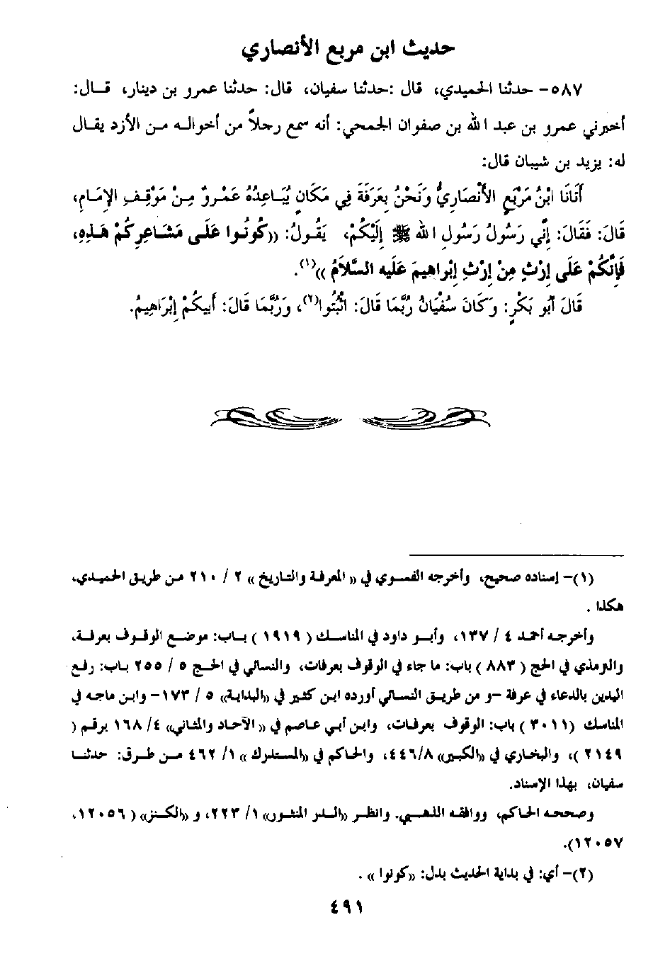 587 - حَدَّثَنَا الْحُمَيْدِيُّ قَالَ: ثنا سُفْيَانُ قَالَ: ثنا عَمْرُو بْنُ دِينَارٍ قَالَ: أَخْبَرَنِي عَمْرُو بْنُ عَبْدِ اللَّهِ بْنِ صَفْوَانَ الْجُمَحِيُّ أَنَّهُ سَمِعَ رَجُلًا مِنْ أَخْوَالِهِ مِنَ الْأَزْدِ يُقَالَ لَهُ يَزِيدُ بْنُ شَيْبَانَ قَالَ: أَتَانَا ابْنُ مِرْبَعٍ الْأَنْصَارِيُّ وَنَحْنُ بِعَرَفَةَ فِي مَكَانٍ يُبَاعِدُهُ عَمْرٌو مِنْ مَوْقِفِ الْإِمَامِ قَالَ: فَقَالَ: إِنِّي رَسُولُ رَسُولِ اللَّهِ صَلَّى اللهُ عَلَيْهِ وَسَلَّمَ إِلَيْكُمْ يَقُولُ: «§كُونُوا عَلَى مَشَاعِرِكُمْ هَذِهِ فَإِنَّكُمْ عَلَى إِرْثٍ مِنْ إِرْثِ إِبْرَاهِيمَ عَلَيْهِ السَّلَامُ» قَالَ أَبُو بَكْرٍ: «وَكَانَ سُفْيَانُ رُبَّمَا قَالَ اثْبُتُوا وَرُبَّمَا قَالَ أَبِيكُمْ إِبْرَاهِيمَ»