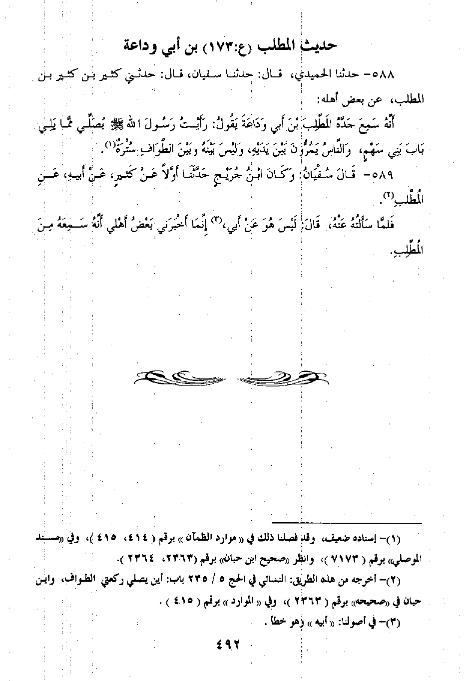 588 - حَدَّثَنَا الْحُمَيْدِيُّ قَالَ: ثنا سُفْيَانُ قَالَ: ثَنِي كَثِيرُ بْنُ كَثِيرِ بْنِ الْمُطَّلِبِ، عَنْ بَعْضِ أَهْلِهِ أَنَّهُ سَمِعَ جَدَّهُ الْمُطَّلِبَ بْنَ أَبِي وَدَاعَةَ يَقُولُ: «رَأَيْتُ رَسُولَ اللَّهِ صَلَّى اللهُ عَلَيْهِ وَسَلَّمَ §يُصَلِّي مِمَّا يَلِي بَابَ بَنِي سَهْمٍ وَالنَّاسُ يَمُرُّونَ بَيْنَ يَدَيْهِ، وَلَيْسَ بَيْنَهُ وَبَيْنَ الطُّوَّافِ سُتْرَةٌ»