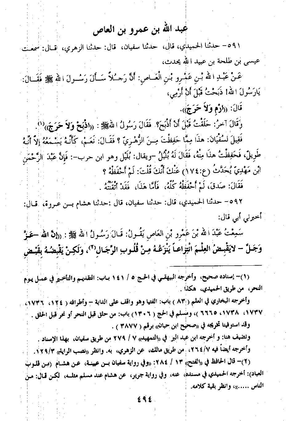 592 - حَدَّثَنَا الْحُمَيْدِيُّ قَالَ: ثنا سُفْيَانُ قَالَ: ثنا هِشَامُ بْنُ عُرْوَةَ قَالَ: أَخْبَرَنِي أَبِي قَالَ: سَمِعْتُ عَبْدَ اللَّهِ بْنَ عَمْرِو بْنِ الْعَاصِ يَقُولُ: قَالَ رَسُولُ اللَّهِ صَلَّى اللهُ عَلَيْهِ وَسَلَّمَ: «إِنَّ §اللَّهَ عَزَّ وَجَلَّ لَا يَقْبِضُ الْعِلْمَ انْتِزَاعًا يَنْزِعُهُ مِنْ قُلُوبِ الرِّجَالِ، وَلَكِنْ يَقْبِضُهُ بِقَبْضِ -[495]- الْعُلَمَاءِ فَإِذَا لَمْ يَتْرُكْ عَالِمًا اتَّخَذَ النَّاسُ رُءُوسًا جُهَّالًا فَسَأَلُوهُمْ فَأَفْتَوْهُمْ بِغَيْرِ عِلْمٍ فَضَلُّوا وَأَضَلُّوا» قَالَ عُرْوَةُ: " ثُمَّ لَبِثْتُ سَنَةً، ثُمَّ لَقِيتُ عَبْدَ اللَّهِ بْنَ عَمْرِو بْنِ الْعَاصِ فِي الطَّوَافِ فَسَأَلْتُهُ عَنْهُ فَأَخْبَرَنِي بِهِ