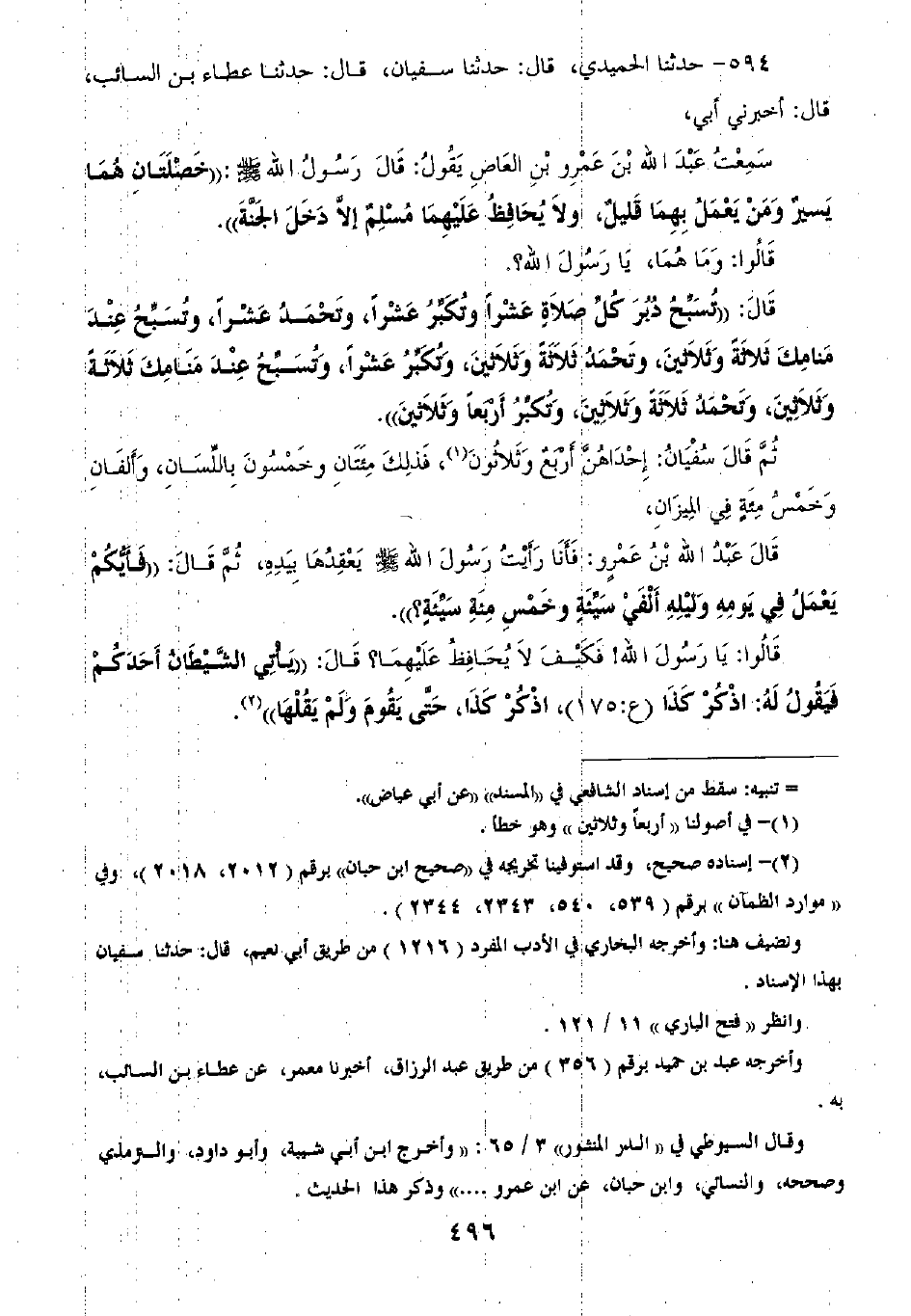 594 - حَدَّثَنَا الْحُمَيْدِيُّ قَالَ: ثنا سُفْيَانُ قَالَ: ثنا عَطَاءُ بْنُ السَّائِبِ قَالَ: أَخْبَرَنِي أَبِي، سَمِعْتُ عَبْدَ اللَّهِ بْنَ عَمْرِو بْنِ الْعَاصِ يَقُولُ: قَالَ رَسُولُ اللَّهِ صَلَّى اللهُ عَلَيْهِ وَسَلَّمَ: «§خَصْلَتَانِ هُمَا يَسِيرٌ وَمَنْ يَعْمَلُ بِهِمَا قَلِيلٌ، وَلَا يُحَافِظُ عَلَيْهِمَا مُسْلِمٌ إِلَّا دَخَلَ الْجَنَّةَ» قَالُوا: وَمَا هُمَا يَا رَسُولَ اللَّهِ قَالَ: «تُسَبِّحُ دُبُرَ كُلِّ صَلَاةٍ عَشْرًا، وَتُكَبِّرُ عَشْرًا، وَتَحْمَدُ عَشْرًا، وَتُسَبِّحُ عِنْدَ مَنَامِكَ ثَلَاثَةً وَثَلَاثِينَ، وَتَحْمَدُ ثَلَاثَةً وَثَلَاثِينَ، وَتُكَبِّرُ أَرْبَعًا وَثَلَاثِينَ» ثُمَّ قَالَ سُفْيَانُ: أَحَدُهُنَّ أَرْبَعًا وَثَلَاثِينَ فَذَلِكَ مِائَتَانِ وَخَمْسِينَ بِاللِّسَانِ، وَأَلْفَانِ وَخَمْسِمِائَةٍ فِي الْمِيزَانِ " قَالَ عَبْدُ اللَّهِ بْنُ عَمْرٍو: فَأَنَا رَأَيْتُ رَسُولَ اللَّهِ صَلَّى اللهُ عَلَيْهِ وَسَلَّمَ يَعْقِدُهَا بِيَدِهِ ثُمَّ قَالَ: «فَأَيُّكُمْ يَعْمَلُ فِي يَوْمِهِ وَلَيْلِهِ أَلْفَيْ سَيِّئَةٍ وَخَمْسِمِائَةِ سَيِّئَةٍ» قَالُوا: يَا رَسُولَ اللَّهِ فَكَيْفَ لَا يُحَافِظُ عَلَيْهِمَا قَالَ: «يَأْتِي الشَّيْطَانُ أَحَدَكُمْ فَيَقُولُ لَهُ اذْكُرْ كَذَا اذْكُرْ كَذَا حَتَّى يَقُومَ وَلَمْ يَقُلْهَا» -[497]- قَالَ سُفْيَانُ: «هَذَا أَوَّلُ شَيْءٍ سَأَلْنَا عَطَاءً عَنْهُ، وَكَانَ أَيُّوبُ أَمَرَ النَّاسَ حِينَ قَدِمَ عَطَاءٌ الْبَصْرَةَ أَنْ يَأْتُوهُ فَيَسْأَلُوهُ عَنْ هَذَا الْحَدِيثِ»