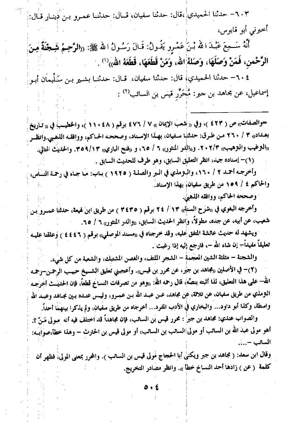 603 - حَدَّثَنَا الْحُمَيْدِيُّ قَالَ: ثنا سُفْيَانُ، قَالَ: ثنا عَمْرُو بْنُ دِينَارِ، قَالَ: أَخْبَرَنِي أَبُو قَابُوسٍ، أَنَّهُ سَمِعَ عَبْدَ اللَّهِ بْنَ عَمْرٍو، يَقُولُ: قَالَ رَسُولُ اللَّهِ صَلَّى اللهُ عَلَيْهِ وَسَلَّمَ: «§الرَّحِمُ شِجْنَةٌ مِنَ الرَّحْمَنِ، فَمَنْ وَصَلَهَا وَصَلَهُ اللَّهُ، وَمَنْ قَطَعَهَا قَطَعَهُ اللَّهُ»