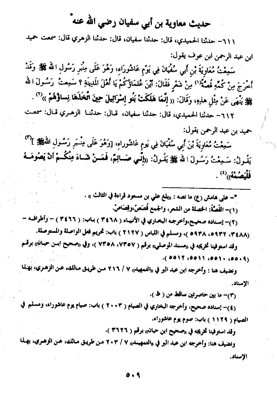 611 - حَدَّثَنَا الْحُمَيْدِيُّ قَالَ: ثنا سُفْيَانُ، قَالَ: ثنا الزُّهْرِيُّ، قَالَ: سَمِعْتُ حُمَيْدَ بْنَ عَبْدِ الرَّحْمَنِ بْنِ عَوْفٍ، يَقُولُ: سَمِعْتُ مُعَاوِيَةَ بْنَ أَبِي سُفْيَانَ فِي يَوْمِ عَاشُورَاءَ وَهُوَ عَلَى مِنْبَرِ رَسُولِ اللَّهِ صَلَّى اللهُ عَلَيْهِ وَسَلَّمَ وَقَدْ أَخْرَجَ مِنْ كُمِّهِ قُصَّتَهً مِنْ شَعْرٍ، فَقَالَ: أَيْنَ عُلَمَاؤُكُمْ يَا أَهْلَ الْمَدِينَةِ؟ سَمِعْتُ رَسُولَ اللَّهِ صَلَّى اللهُ عَلَيْهِ وَسَلَّمَ يَنْهَى عَنْ مِثْلِ هَذِهِ، وَقَالَ: «إِنَّمَا §هَلَكَتْ بَنُو إِسْرَائِيلَ حِينَ اتَّخَذَهَا نِسَاؤُهُمْ»
