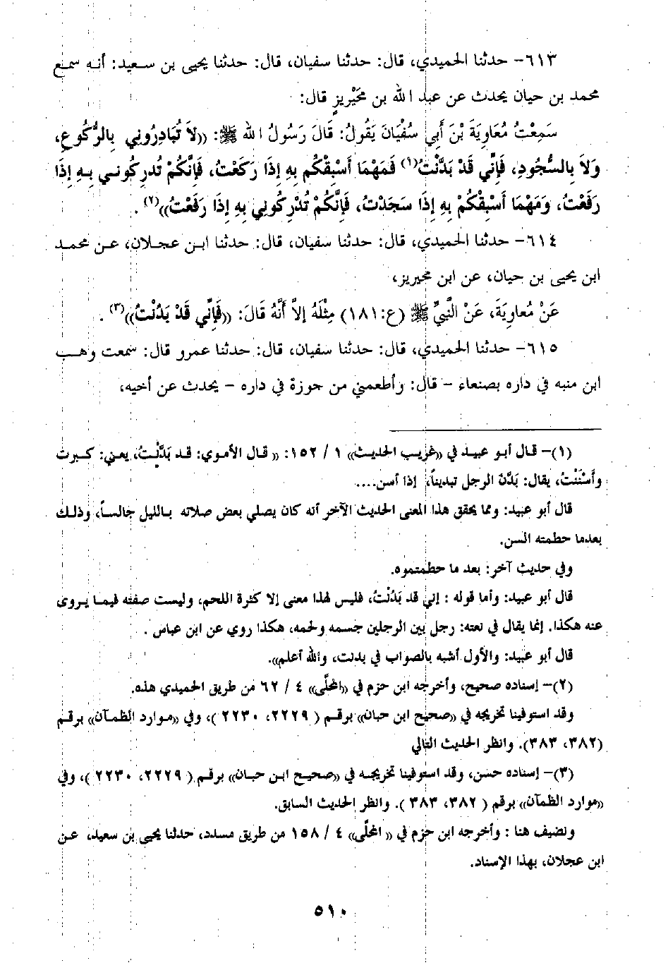 613 - حَدَّثَنَا الْحُمَيْدِيُّ قَالَ: ثنا سُفْيَانُ، قَالَ: ثنا يَحْيَى بْنُ سَعِيدٍ، أَنَّهُ سَمِعَ مُحَمَّدَ بْنَ يَحْيَى بْنِ حَبَّانَ يُحَدِّثُ، عَنِ عَبْدِ اللَّهِ بْنِ مُحَيْرِيزٍ، قَالَ: سَمِعْتُ مُعَاوِيَةَ بْنَ أَبِي سُفْيَانَ، يَقُولُ: قَالَ رَسُولُ اللَّهِ صَلَّى اللهُ عَلَيْهِ وَسَلَّمَ: «§لَا تُبَادِرُونِي بِالرُّكُوعِ وَلَا بِالسُّجُودِ، فَإِنِّي قَدْ بَدَّنْتُ، فَمَهْمَا أَسْبِقُكُمْ إِذَا رَكَعْتُ فَإِنَّكُمْ تُدْرِكُونِي بِهِ إِذَا رَفَعْتُ، وَمَهْمَا أَسْبِقُكُمْ بِهِ إِذَا سَجَدْتُ، فَإِنَّكُمْ تُدْرِكُونِي بِهِ إِذَا رَفَعْتُ» .