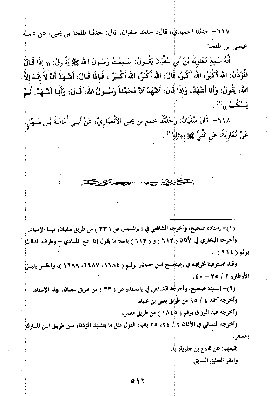 617 - حَدَّثَنَا الْحُمَيْدِيُّ قَالَ: ثنا سُفْيَانُ، قَالَ: ثنا طَلْحَةُ بْنُ يَحْيَى، عَنْ عَمِّهِ عِيسَى بْنِ طَلْحَةَ، أَنَّهُ سَمِعَ مُعَاوِيَةَ بْنَ أَبِي سُفْيَانَ، يَقُولُ: سَمِعْتُ رَسُولَ اللَّهِ صَلَّى اللهُ عَلَيْهِ وَسَلَّمَ §إِذَا قَالَ الْمُؤَذِنُ: اللَّهُ أَكْبَرُ اللَّهُ أَكْبَرُ، قَالَ: «اللَّهُ أَكْبَرُ اللَّهُ أَكْبَرُ» ، فَإِذَا قَالَ: أَشْهَدُ أَنْ لَا إِلَهَ إِلَّا اللَّهُ، يَقُولُ: «وَأَنَا أَشْهَدُ» ، وَإِذَا قَالَ: أَشْهَدُ أَنَّ مُحَمَّدًا رَسُولُ اللَّهِ، قَالَ: «وَأَنَا أَشْهَدُ» ، ثُمَّ يَسْكُتُ،