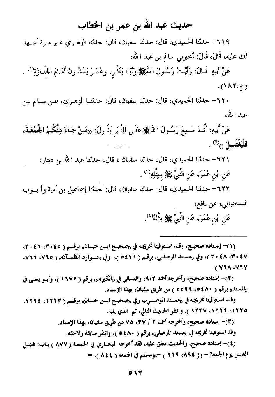 620 - حَدَّثَنَا الْحُمَيْدِيُّ قَالَ: ثنا سُفْيَانُ، قَالَ: ثنا الزُّهْرِيُّ، عَنْ سَالِمِ بْنِ عَبْدِ اللَّهِ، عَنْ أَبِيهِ، أَنَّهُ سَمِعَ رَسُولَ اللَّهِ صَلَّى اللهُ عَلَيْهِ وَسَلَّمَ عَلَى الْمِنْبَرِ يَقُولُ: «§مَنْ جَاءَ مِنْكُمُ الْجُمُعَةَ فَلْيَغْتَسِلْ»