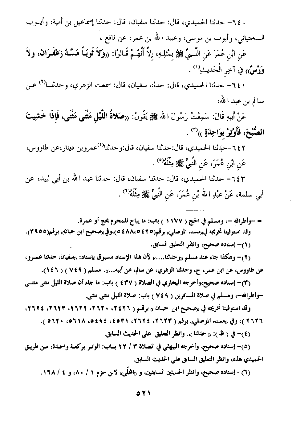 642 - حَدَّثَنَا الْحُمَيْدِيُّ قَالَ: ثنا سُفْيَانُ، قَالَ: حَدَّثَنَا عَمْرُو بْنُ دِينَارٍ، عَنْ طَاوُسٍ، عَنِ ابْنِ عُمَرَ، عَنِ النَّبِيِّ صَلَّى اللهُ عَلَيْهِ وَسَلَّمَ مِثْلَهُ -[522]-.