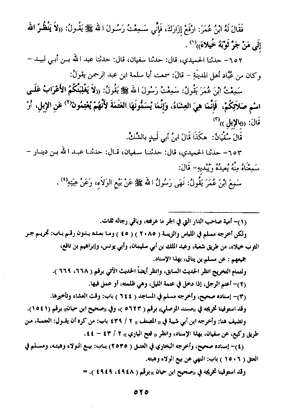 653 - حَدَّثَنَا الْحُمَيْدِيُّ قَالَ: ثنا سُفْيَانُ، قَالَ: ثنا عَبْدُ اللَّهِ بْنُ دِينَارٍ، سَمِعْنَاهُ مِنْهُ يُعِيدُهُ، وَيُبْدِيهِ، قَالَ: سُمِعَ ابْنُ عُمَرَ، يَقُولُ: «§نَهَى رَسُولُ اللَّهِ صَلَّى اللهُ عَلَيْهِ وَسَلَّمَ عَنْ بَيْعِ الْوَلَاءِ، وَعَنْ هِبَتِهِ» -[526]-، فَقِيلَ لَهُ: إِنَّ شُعْبَةَ اسْتَحْلَفَ عَبْدَ اللَّهِ عَلَيْهِ، قَالَ: لَكِنَّا لَمْ نَسْتَحْلِفْهُ سَمِعْنَاهُ مِنْهُ مِرَارًا، ثُمَّ ضَحِكَ سُفْيَانُ